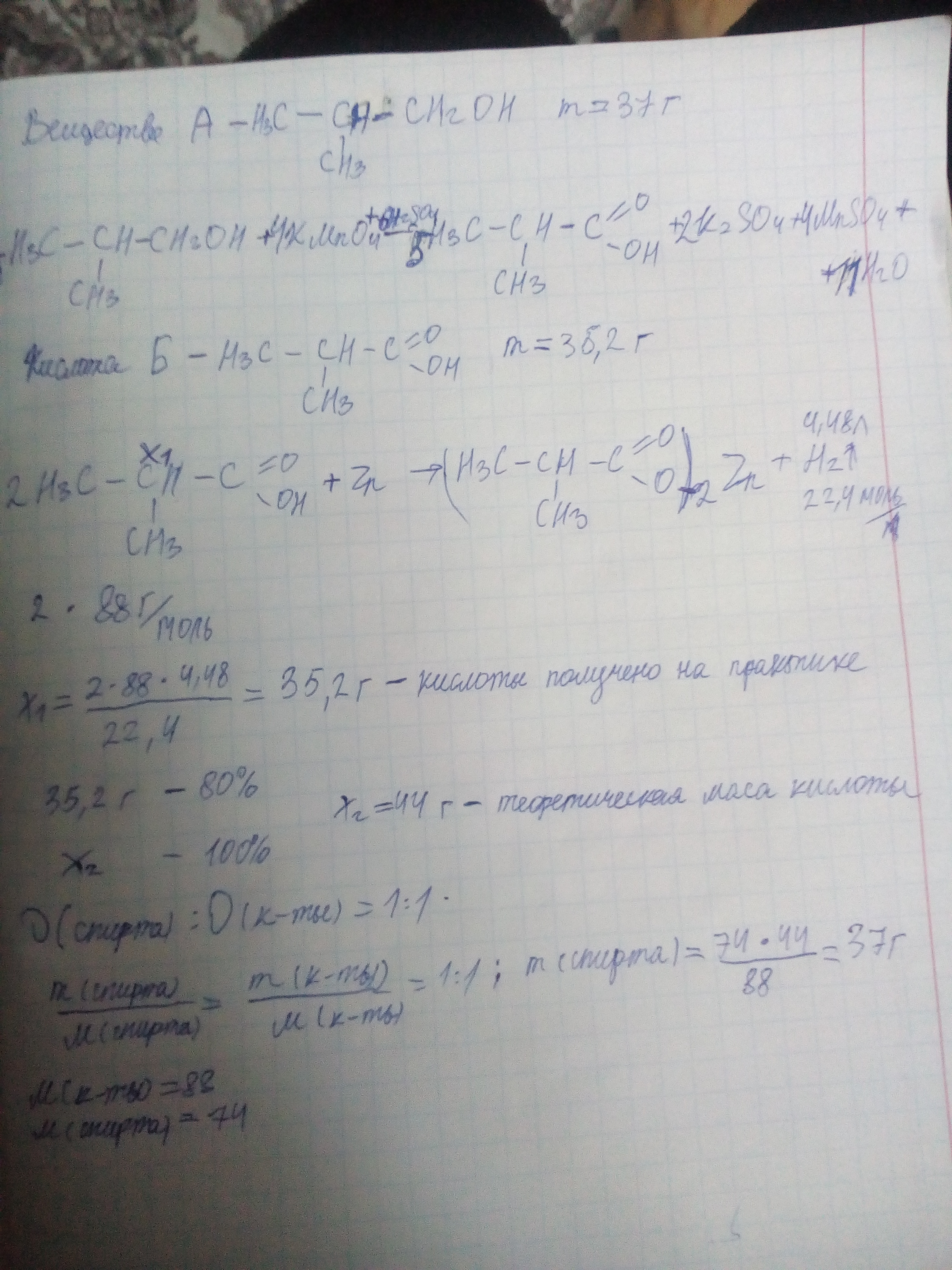 При окислении предельного одноатомного спирта А получена с выходом 80% кислота Б с тем же числом атомов углерода. При действии на кислоту Б избытка металлического цинка выделилось 4,48 л водорода. Какая кислота и в каком количестве была получена и сколько и какого спирта потребовалось для реакции, если при дегидратации спирта А образуется изобутилен?