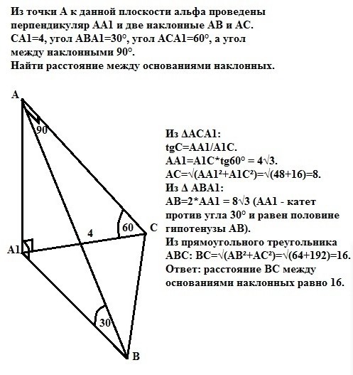 3)Из точки А к данной плоскости а проведены перпендикуляр АО и две наклонные АВ и АС, СО=4 см, угол АВО=30°, угол АСО=60°, а угол между наклонными 90°. Найдите расстояние между основаниями наклонных.