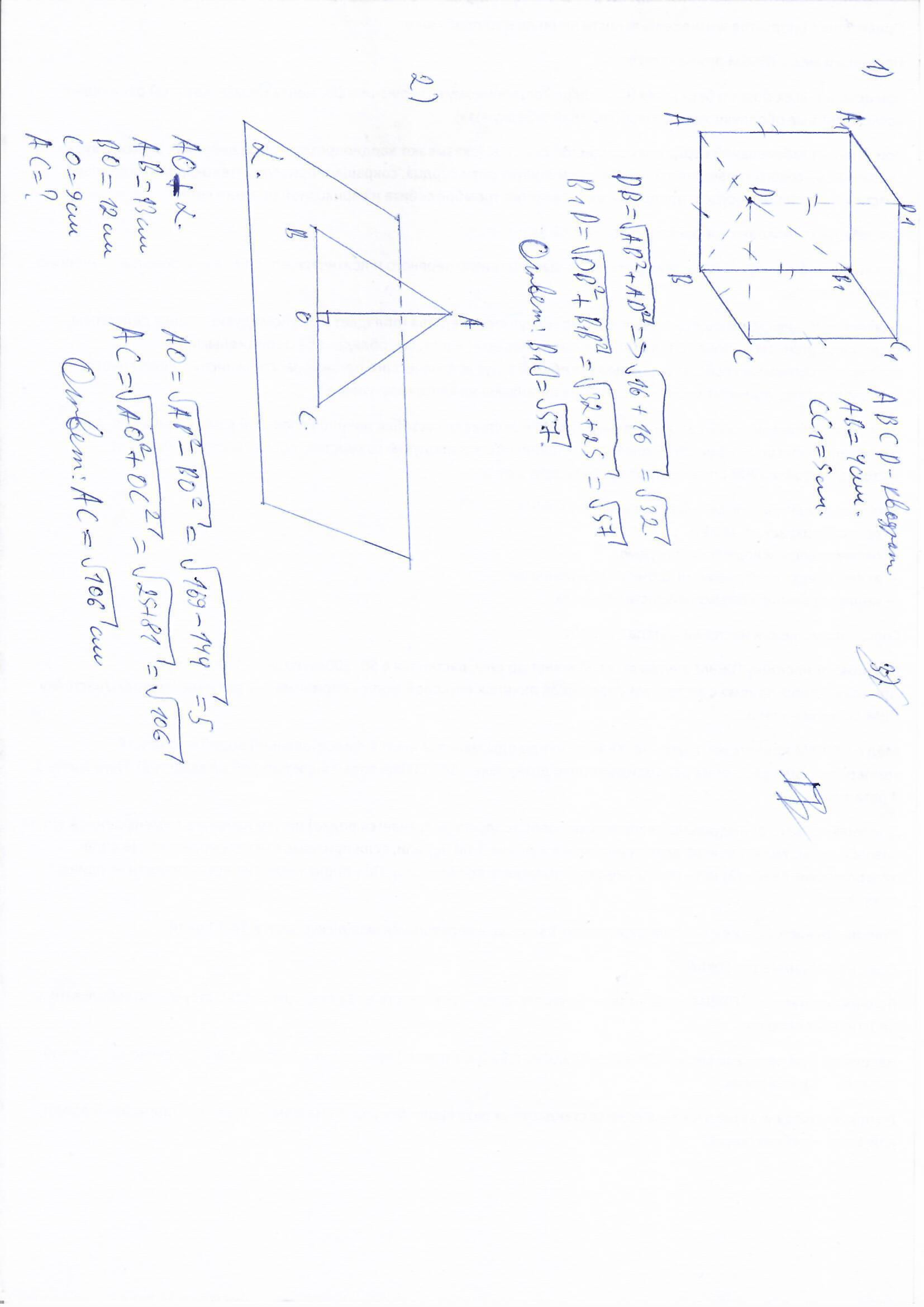 2)Из точки А к плоскости а проведен перпендикуляр АО и две наклонные АВ и АС. Найдите длину наклонной АС, если АВ=13 см и проекции этих наклонных равны: ВО=12 см, СО=9 см.