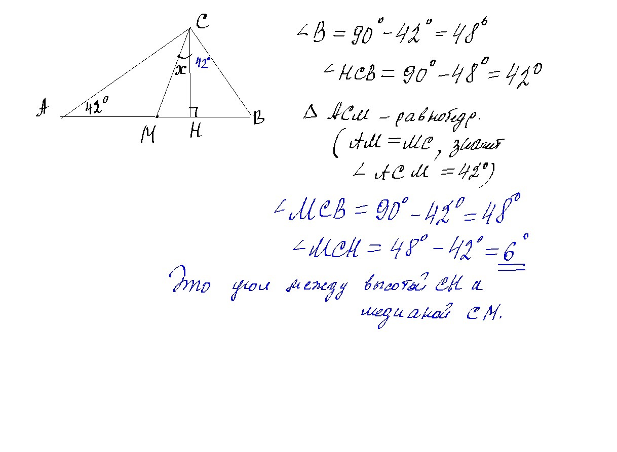 В прямоугольном треугольнике ABC с прямым углом C, уголA равен 42 ∘ . Чему равен угол между медианой и высотой, выходящими из вершины C?