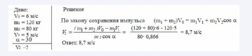 Тележка, масса которой 120 кг, движется по рельсам без трения со скоростью 6 м/с. С тележки соскакивает человек массой 80 кг под углом 30° к направлению её движения в горизонтальной плоскости. Скорость тележки уменьшается при этом до 5 м/с. Какова была скорость человека во время прыжка относительно Земли?