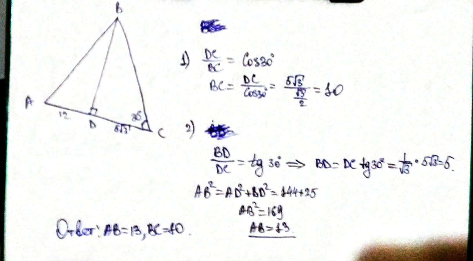 В треугольнике ABC сторона BC образует с основанием AC угол,который = 30 градусов.А высота,проведённая с вершины B делит основание на отрезки.AD=12см,DC=5√3 см.Найдите боковые стороны треугольника.
