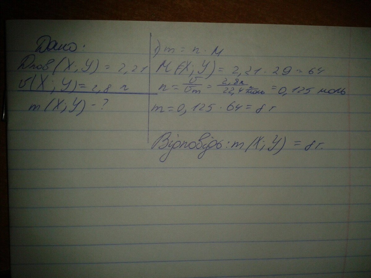 Невідомий газ має густину за повітрям 2.21.Визначте масу цього газу якщо його об'єм дорівнює 2.8 л (н.у.)
