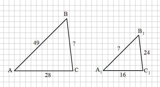 треугольники ABC и A1B1C1 подобны, причем сторонам AC и BC соответствуют стороны A1C1 и B1C1. Найдите неизвестные стороны этих треугольников, если AC = 28 см, AB = 49 см, B1C1 = 24 см, A1C1 = 16 см.