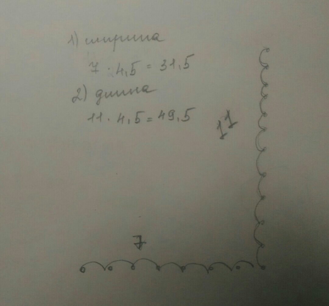 Для ограждения садового участка забором были поставлены опоры: 8 штук по ширине участка и 12 штук по длине. Найдите длину и ширину садового участка, если расстояние между опорами 4,5 метров.