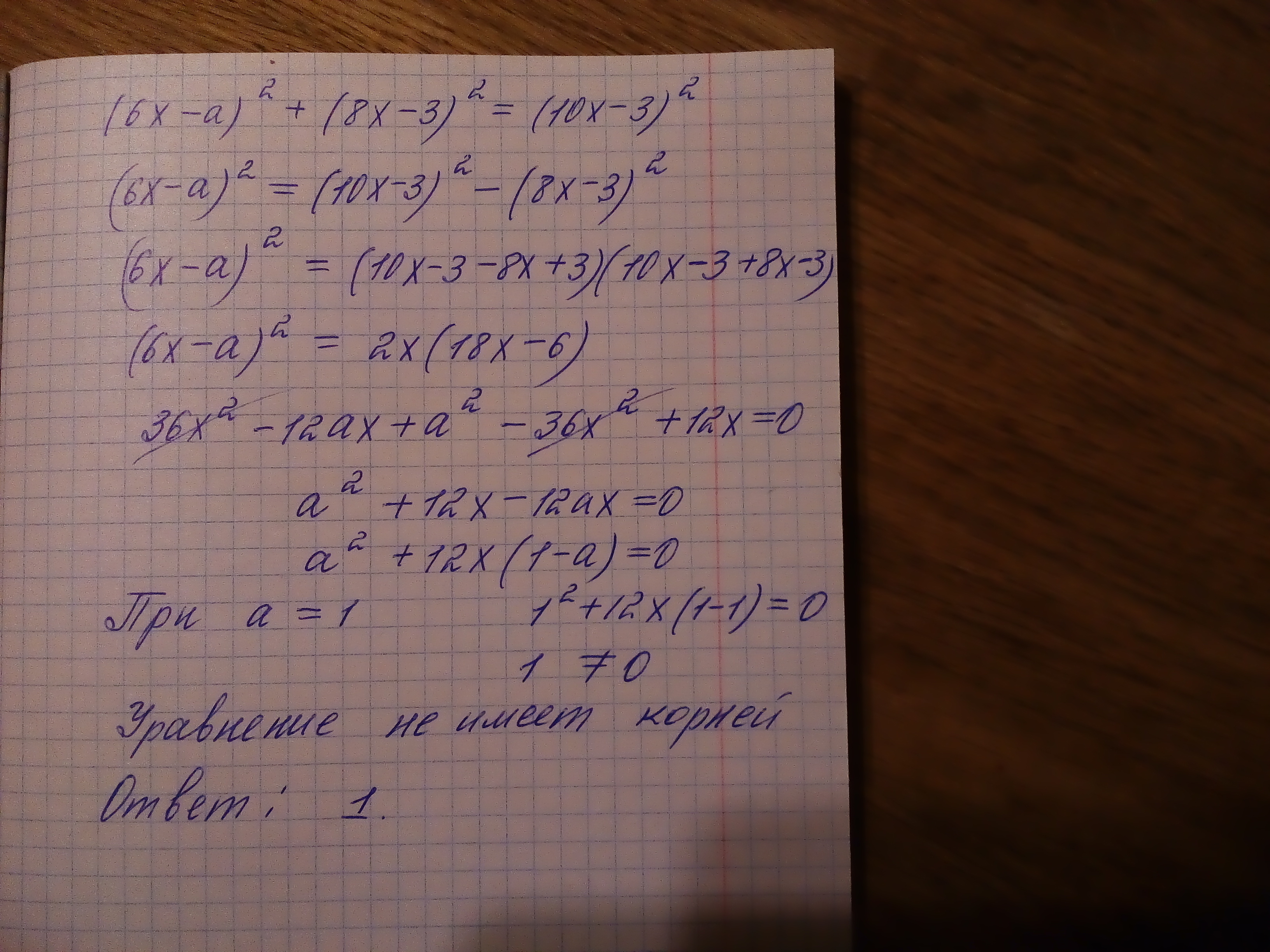 при каком значении а уравнение не имеет корней (6x - a) в квадрате + ( 8x - 3) в квадрате = (10x - 3) в квадрате