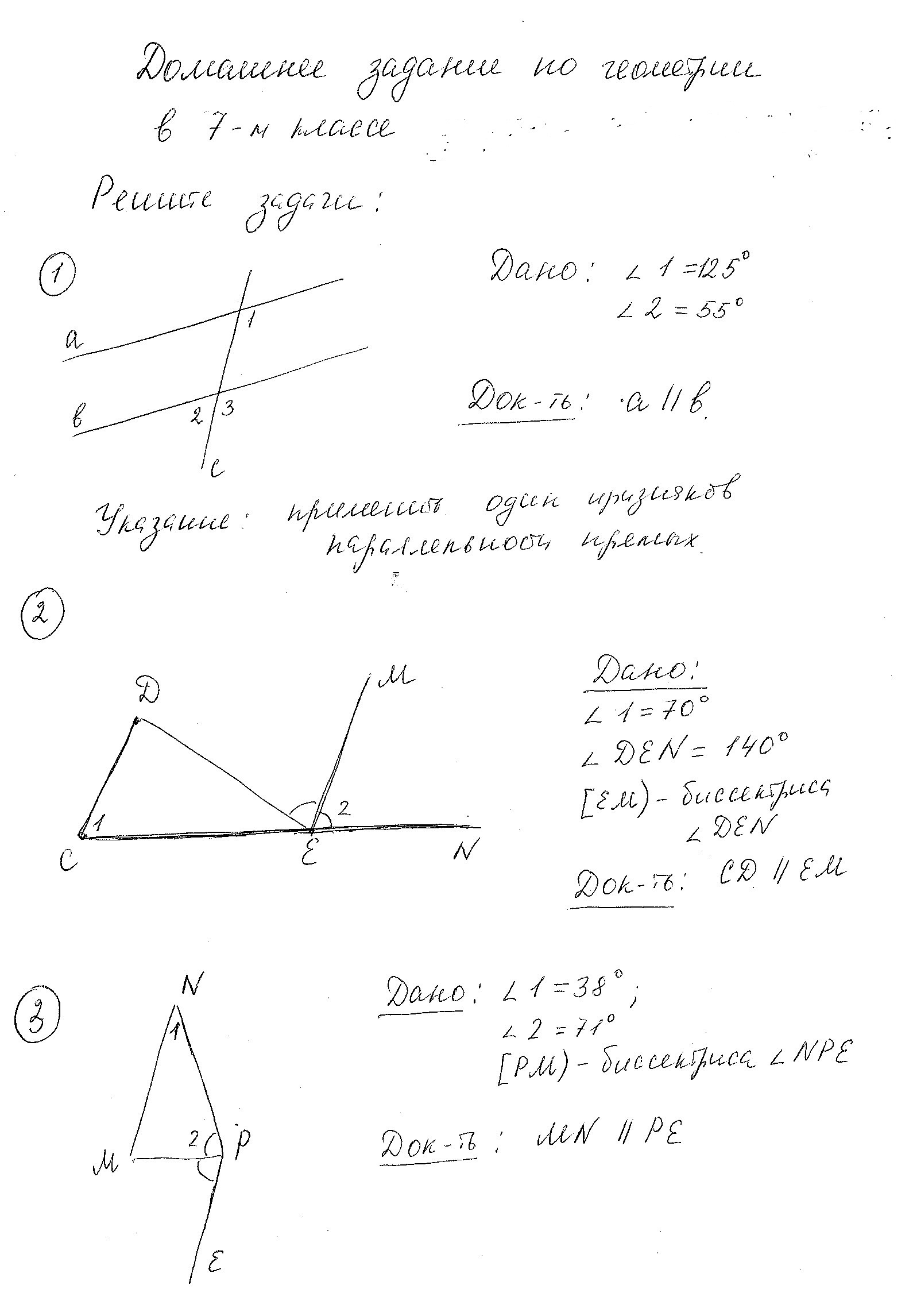 1) ∠3 = 180° - 55° = 125° - так как они смежные; ∠1 = ∠3 , а они соответственные ⇒ a ║ b 2)∠2 = 140° : 2 = 70°; ⇒∠1 = ∠2 = 70° а они соответственные ⇒ CD ║EM; 3) ∠1 = 38°; ∠2 = 71°; ∠M = 180° - (38° + 71°) = 71° ; ∠MPE = 71° - так как PE биссектриса; ⇒ ∠M = ∠MPE = 71° (а они накрест лежащие) ⇒ MN ║PE