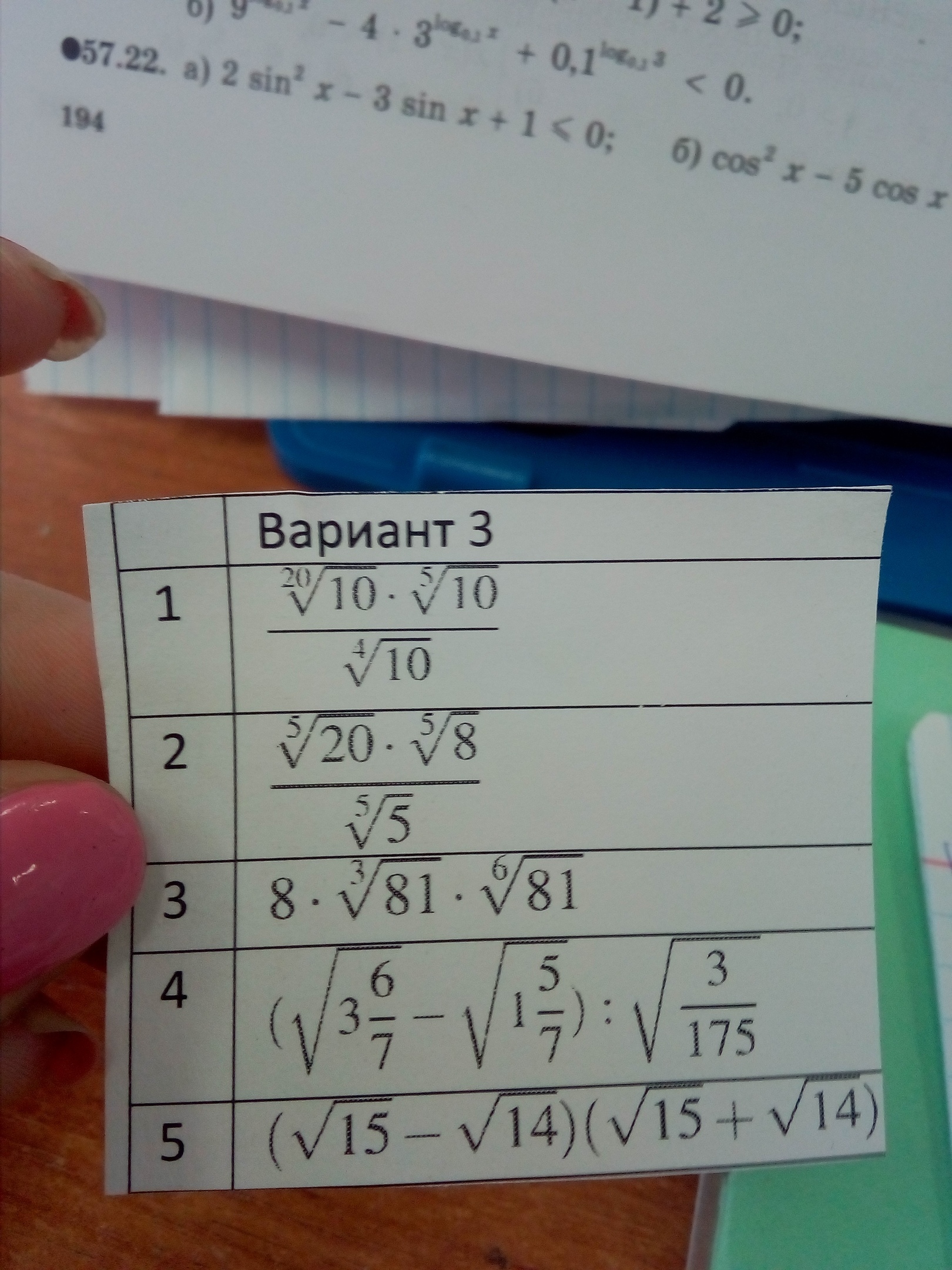 1.;frac{sqrt[20]{10}cdotsqrt[5]{10}}{sqrt[4]{10}}=10^{frac1{20}}cdot10^{frac15}cdot10^{-frac14}=10^{frac1{20}+frac15-frac14}=10^{frac1{20}+frac4{20}-frac5{20}}=10^0=1\\2.;frac{sqrt[5]{20}cdotsqrt[5]{8}}{sqrt[5]5}=frac{sqrt[5]{20cdot8}}{sqrt[5]5}=sqrt[5]{frac{160}5}=sqrt[5]{32}=2\\3.;8cdotsqrt[3]{81}cdotsqrt[6]{81}=8cdot81^{frac13}cdot81^{frac16}=8cdot81^{frac13+frac16}=8cdot81^{frac26+frac16}=8cdot81^{frac12}=8sqrt{81}=8cdot9=72