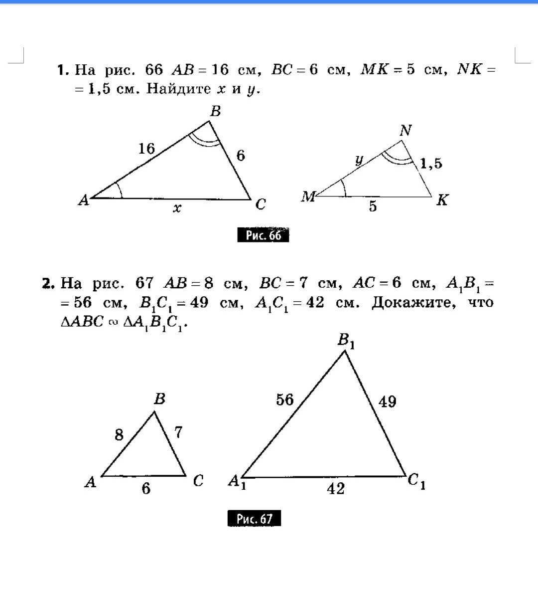 1. Треугольники ABC и MNK подобны, потому отношение соответствующих сторон у них равное.