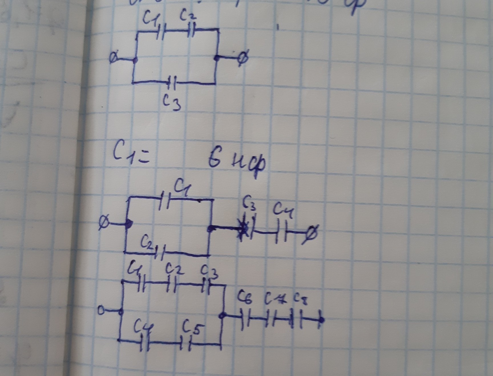3) С12345= (2+3)=5, С678=2, Собщ=5*2/(5+2)= 10/7≈1.43 нФ