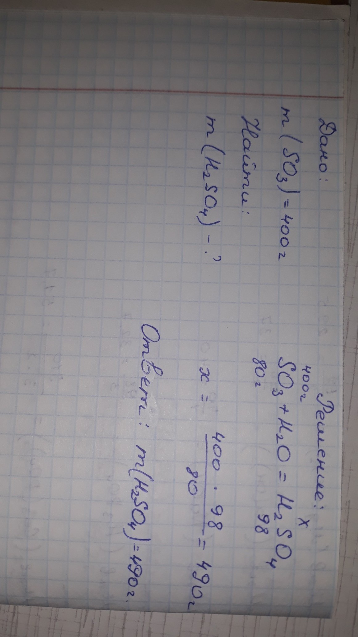 сколько граммов серной кислоты образуется при полном взаимодействии 400 г SO3 с избытком воды? ПОМОГИТЕ ПОЖАЛУЙСТА