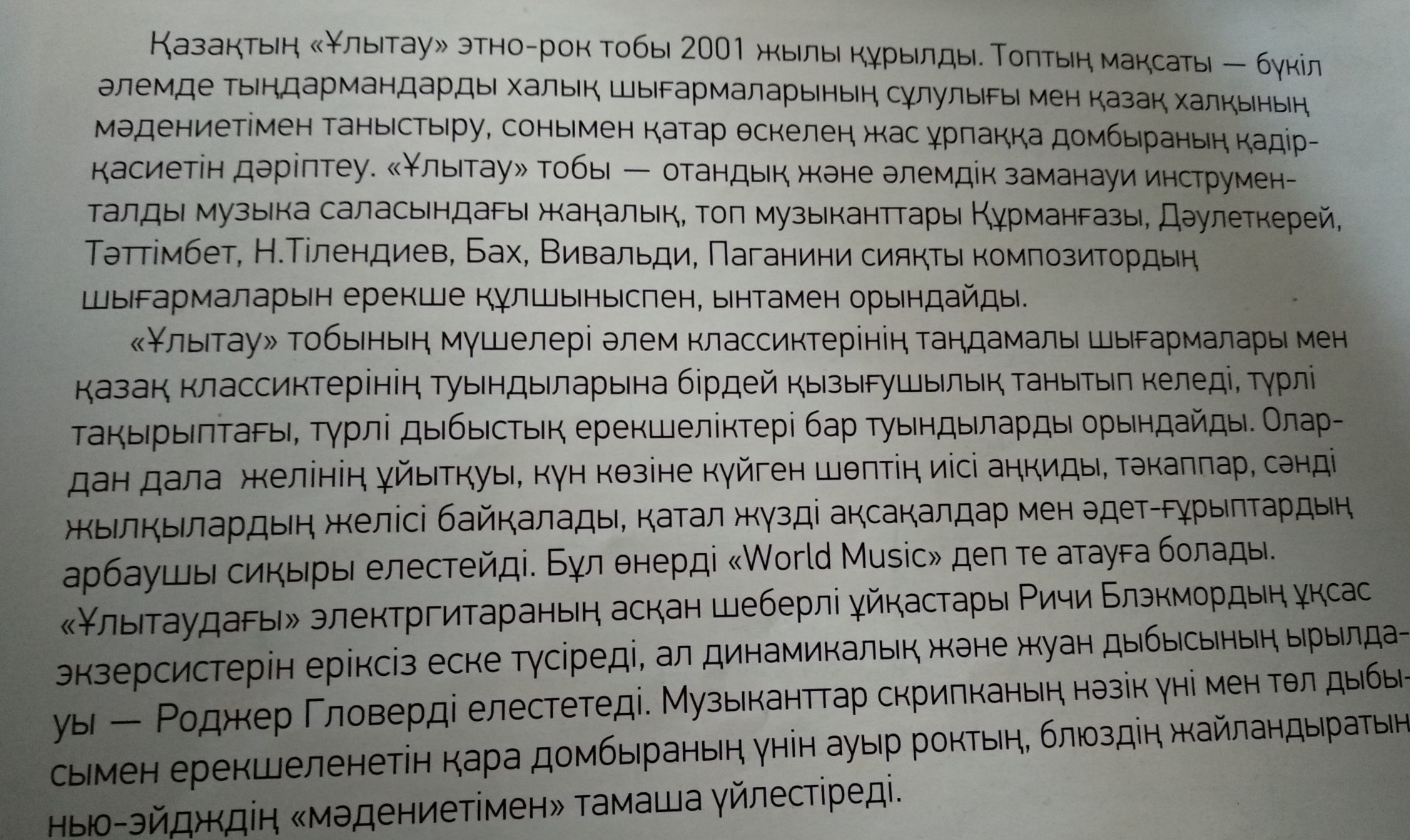 Казахская этно-рок группа "Улытау" была образована в 2001 году. Цель группы-познакомить слушателей во всем мире с красотой народных произведений и культурой казахского народа. а также привить молодому поколению уважение к домбре. Группа "Улытау" - новаторство в области отечественной и мировой современной музыки, Музыканты группы Курмангазы, Даулетнерей, Таттимбет, н. С особым энтузиазмом и энтузиазмом исполняют произведения номпозора Тлендиева, Бах, Вивальди, Паганини. члены группы "* Улытау " проявляют одинаковый интерес к произведениям классиков мира и казахских классиков, исполняют произведения различной тематики, имеющие разные звуки. от Блэра освящение степной линии, запах сухой травы на солнце, прослеживается сеть такаппаров, роскошных лошадей, представляет собой волшебную магию суровых жузов старейшин и обычаев. Это искусство также можно назвать "World Music". В» Улытау " особенные мастера сна электргитары невольно вспоминают подобных экзерсистов Ричи Блэкмора, а при динамическом и толстом звуке - Роджера Гловера. Музыканты прекрасно сочетают мелодию черной домбры, отличающуюся нежным звучанием скрипки и звуком тел, с «культурой» 0-эйджа, благоустроивающей дух, блюз. закрыть