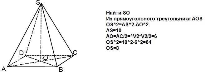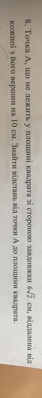 Точка А , что не лежит в плоскости квадрата со стороной длинной 6√2 см , отделена от каждой из его вершин на 10 см. Найти расстояние от точки А к плоскости квадрата .