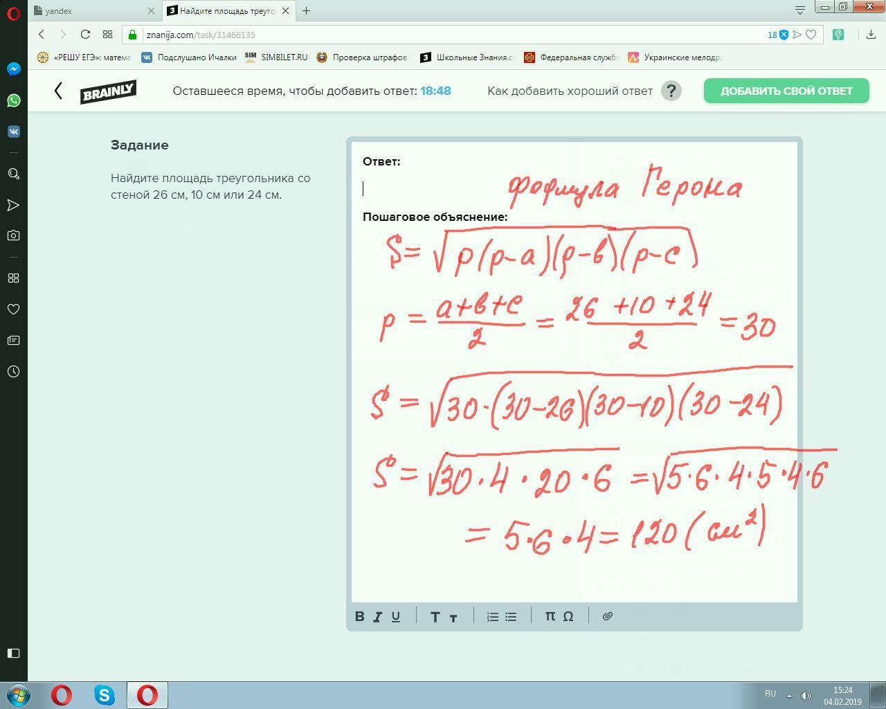 Найдите площадь треугольника со стеной 26 см, 10 см или 24 см.