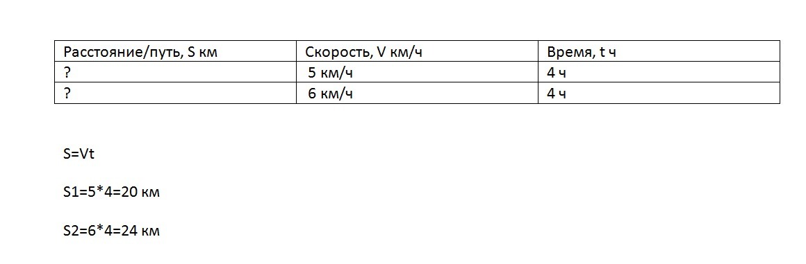 Первый пешеход шел со скоростью 5 км/ч, второй пешеход шел со скоростью 6 км/ч. Найдите пройденный путь каждого пешехода если они шли 4 часа.