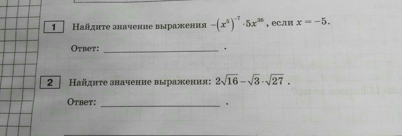 1); ; x=-5\\-(x^5)^{-7}cdot 5x^{36}=-x^{-35}cdot 5x^{36}=-5cdot x=-5cdot (-5)=25\\2); ; 2sqrt{16}-sqrt3cdot sqrt{27}=2sqrt{4^2}-sqrt{3cdot 27}=2cdot 4-sqrt{3^4}=8-3^2=8-9=-1