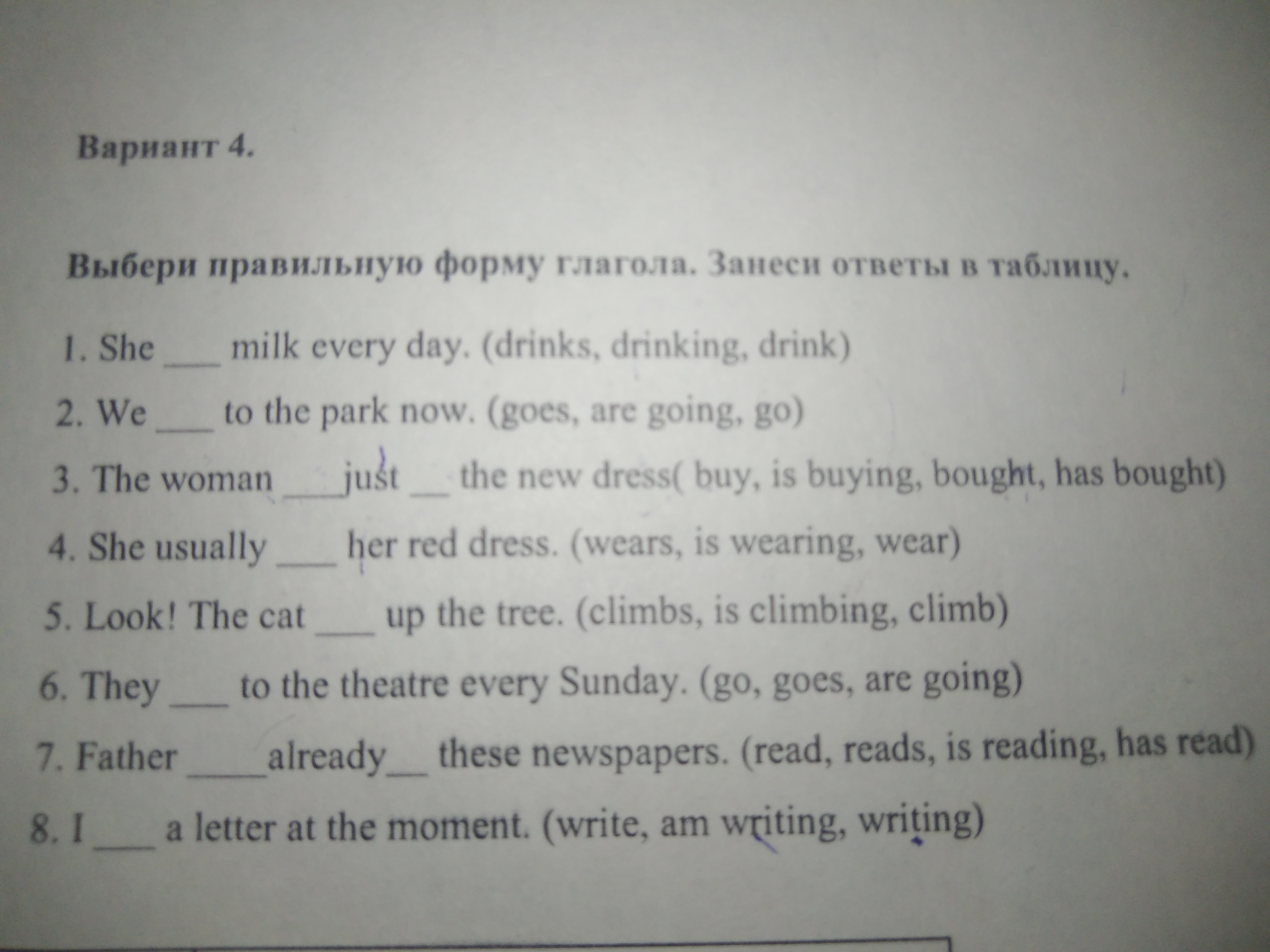 drinks, are going, has bought, wears, is climbing, go, has read, am writing