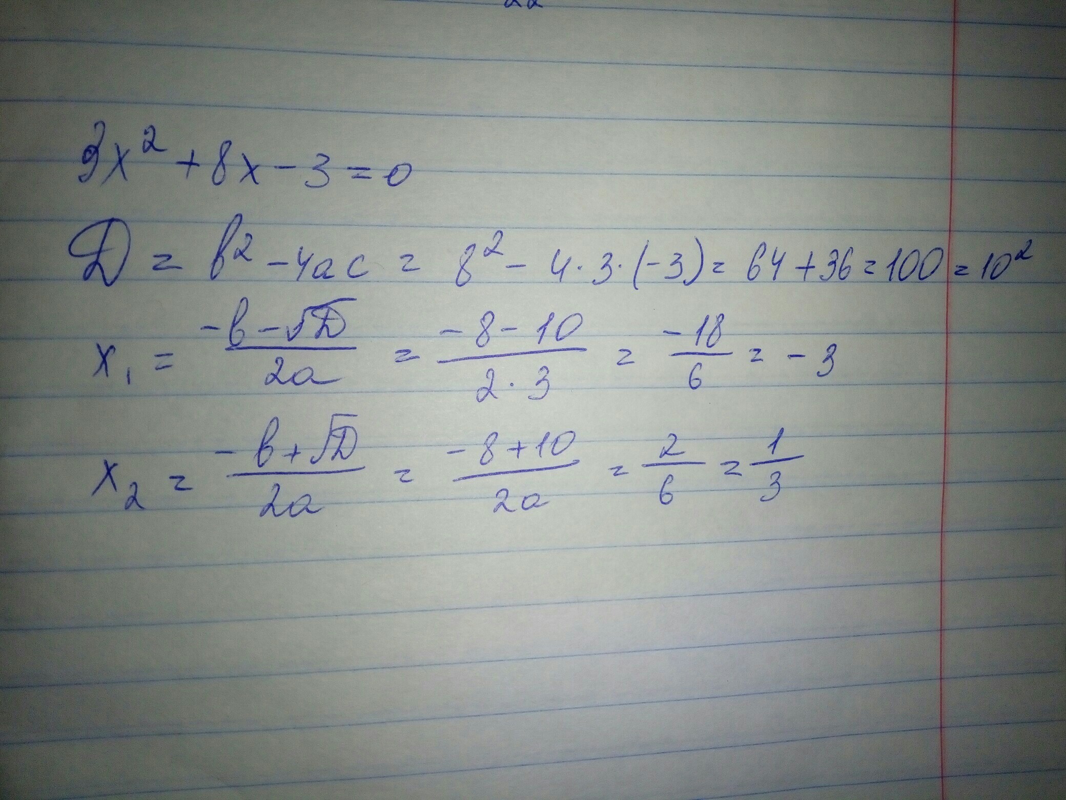 D=8^2-4×3×(-3) =100