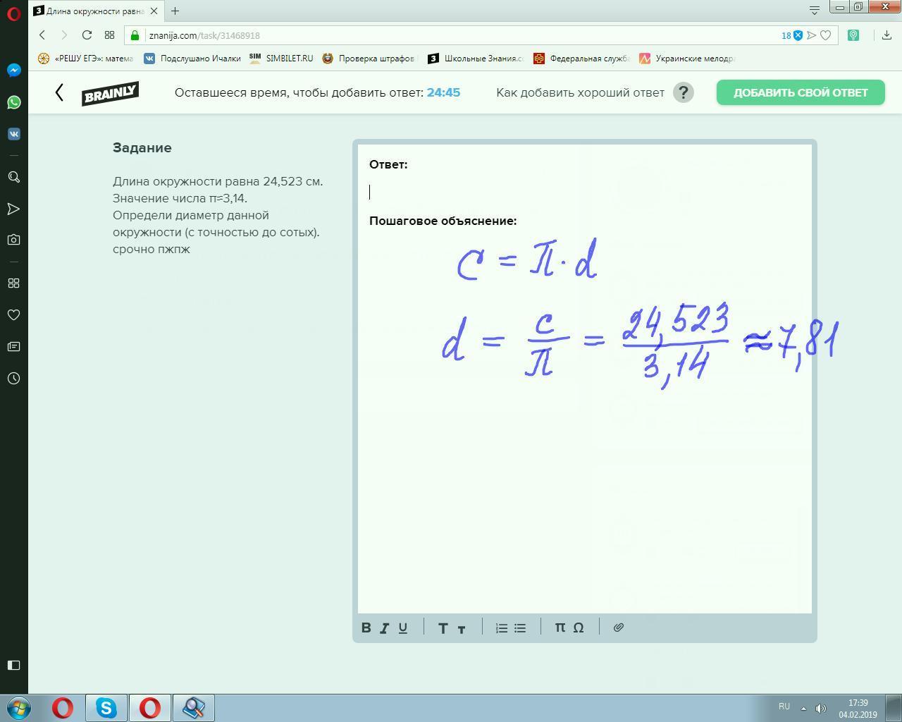 Длина окружности равна 24,523 см. Значение числа π≈3,14.