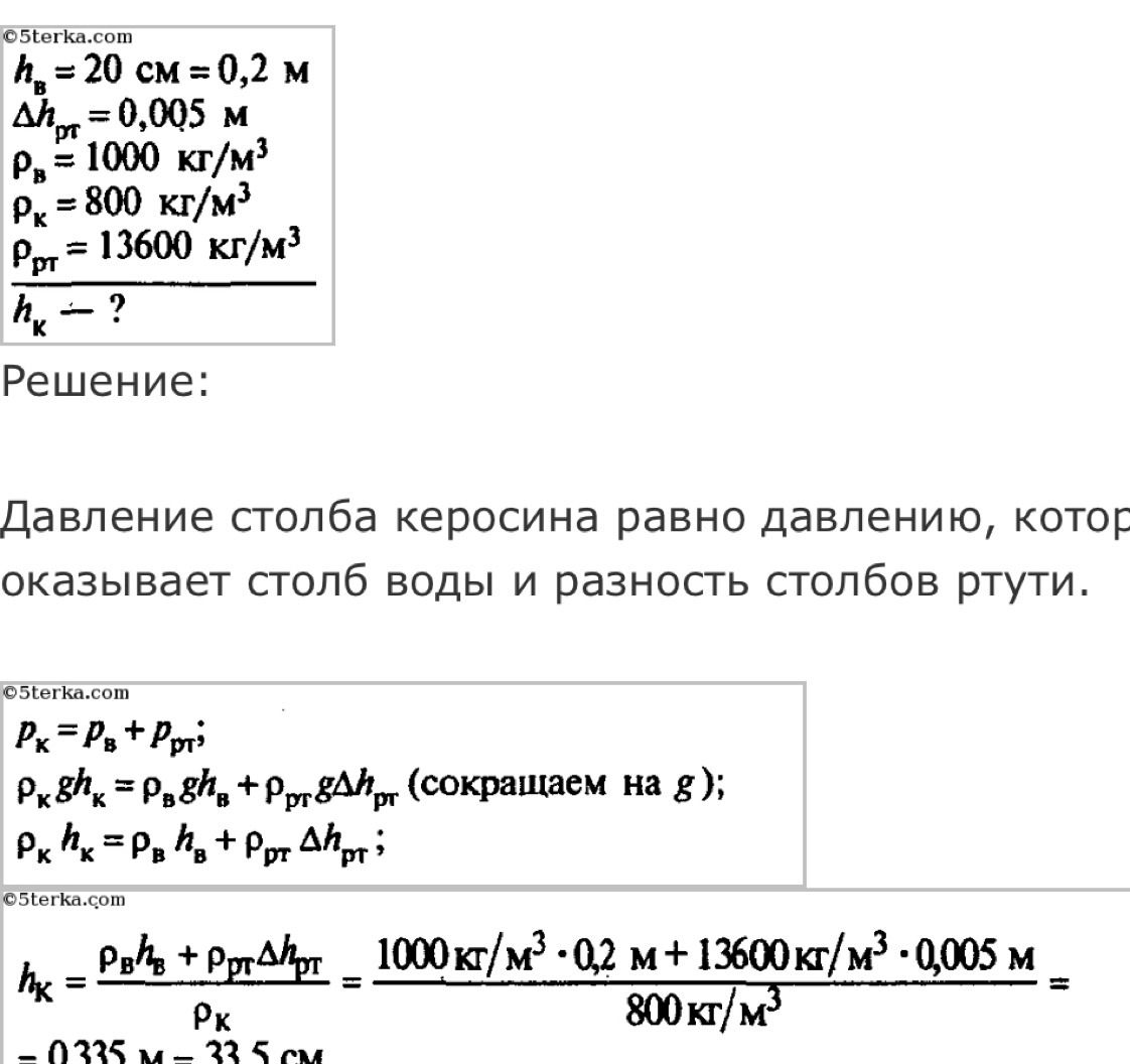 В сообщающиеся сосуды налиты ртуть, вода и керосин. Какова высота слоя керосина, если высота столба воды 20см и в правом колене уровень ртути ниже, чем в левом на 5мм?