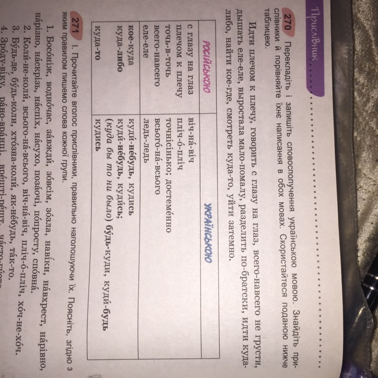 Йти плiч-о-плiч,розмовляти вiч-на-вiч,всього-на-всього не сумуй,дихати ледь-ледь,пiдростала помаленьку,подiлити по-братерськи,iти кудись,знайти де-небудь,дивитися кудись,пiти затемна.