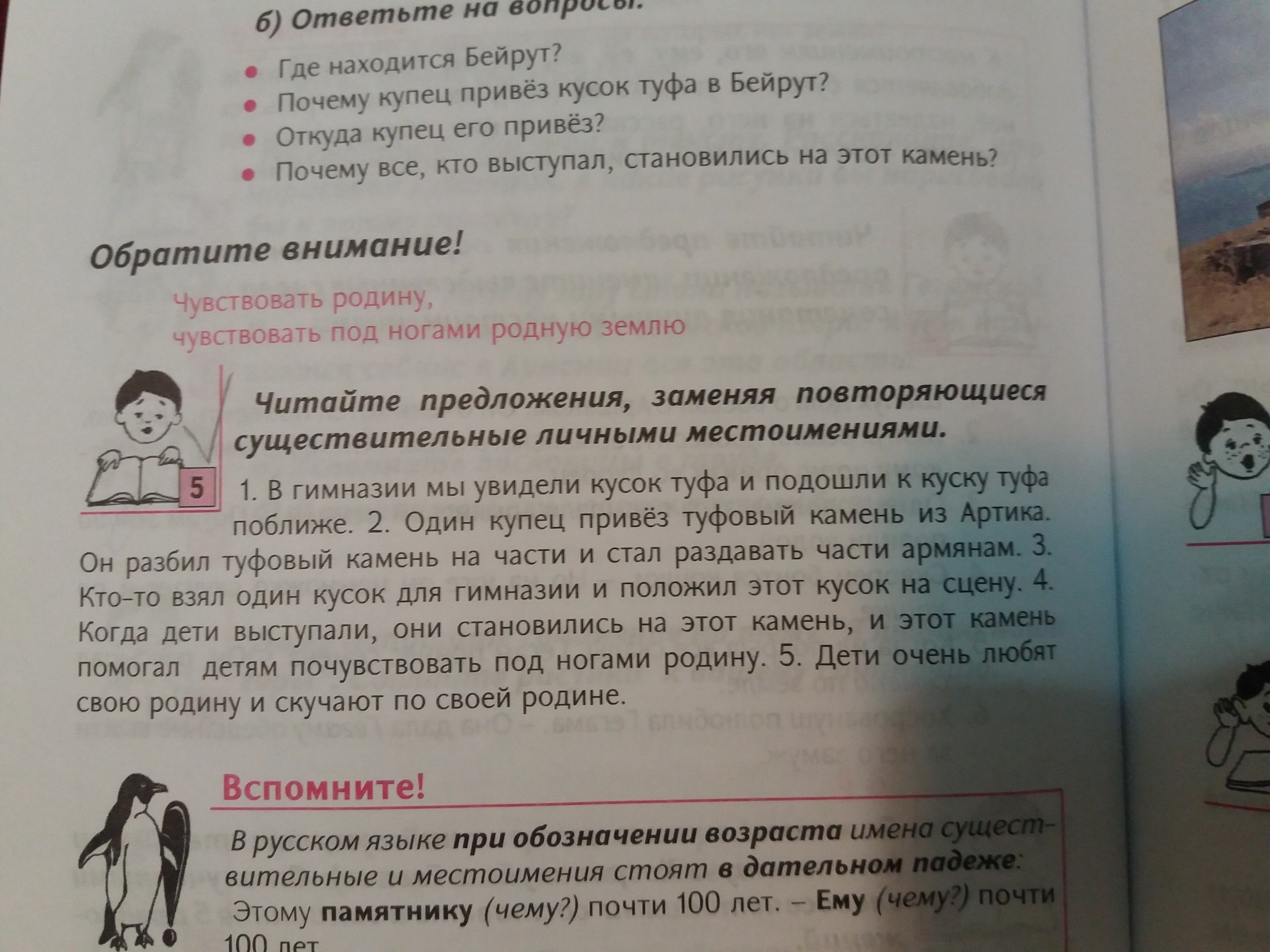 1)В гимназии мы увидели кусок туфа и подошли к нему поближе 2) Один купец привез туфовый камень из Артики. Он разбил его на части и стал раздавать их армянам 3) Кто-то взял один кусочек для гимназии и положил его на сцену 4) Когда дети выступали, они становились на этот камень, и он помогал им почувствовать под ногами родину 5) Дети очень любят свою родину и скучают по ней!
