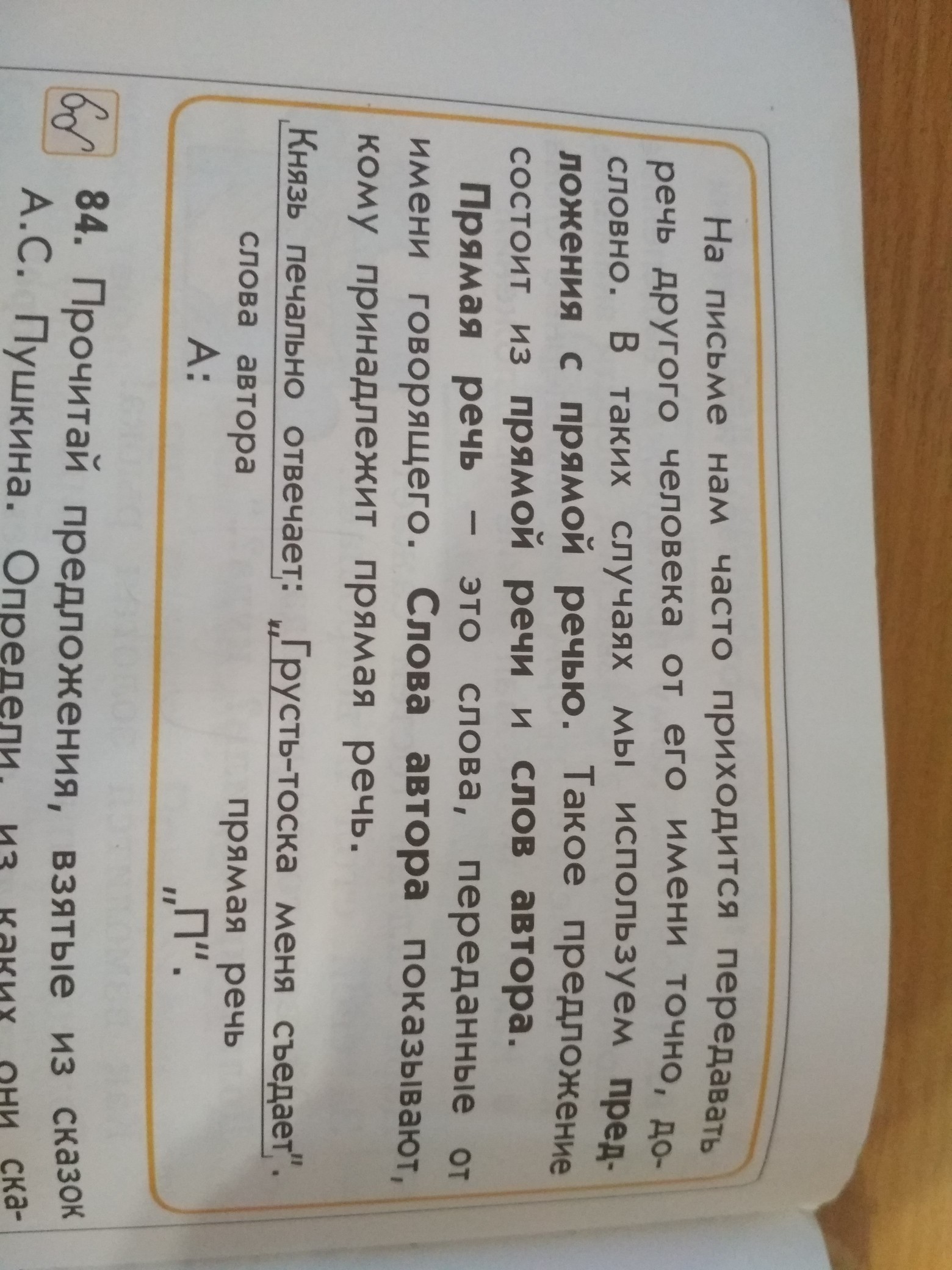 прямая речь заключается в кавычки. Первое слово прямой речи пишется с большой буквы. После слов автора перед прямой речью ставится двоеточие, в конце предложений с прямой речью ставится точка, вопросительный, восклицательный,многоточие . (А:„П!”)
