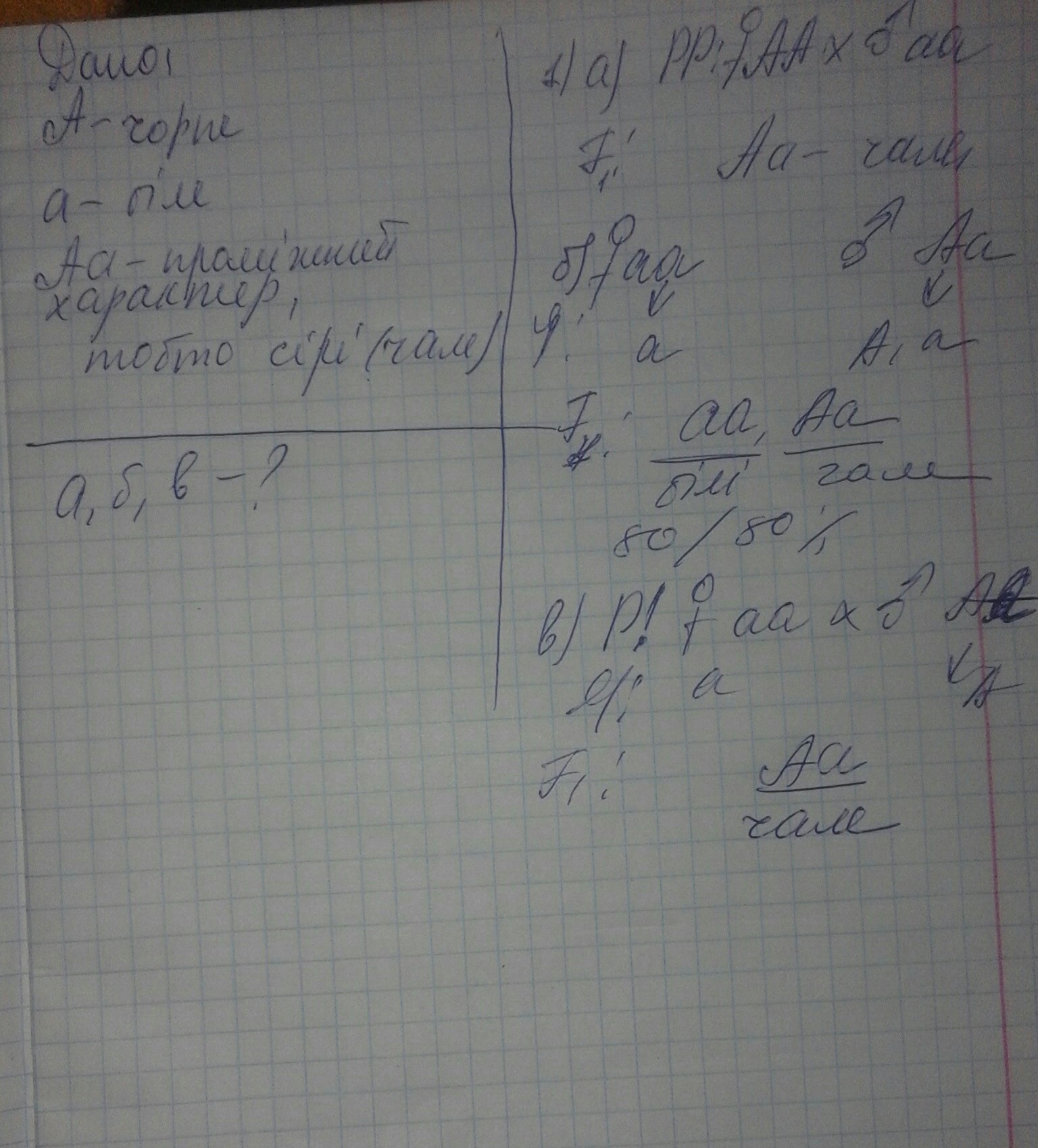 У корів чорне забарвлення шерсті не повністю домінує над білим: гетерозиготи мають проміжний фенотип — чале (сіре) забарвлення шерсті. Запропонуйте схеми схрещування, щоб: а) у корови з чорним забарвленням шерсті народжувалися телята лише з чалим забарвленням шерсті; б) від бика з чалим забарвленням шерсті народжувалися телята з білим забарвленням шерсті; в) у корови з білим забарвленням шерсті народжувалися телята з чалим забарвленням шерсті.