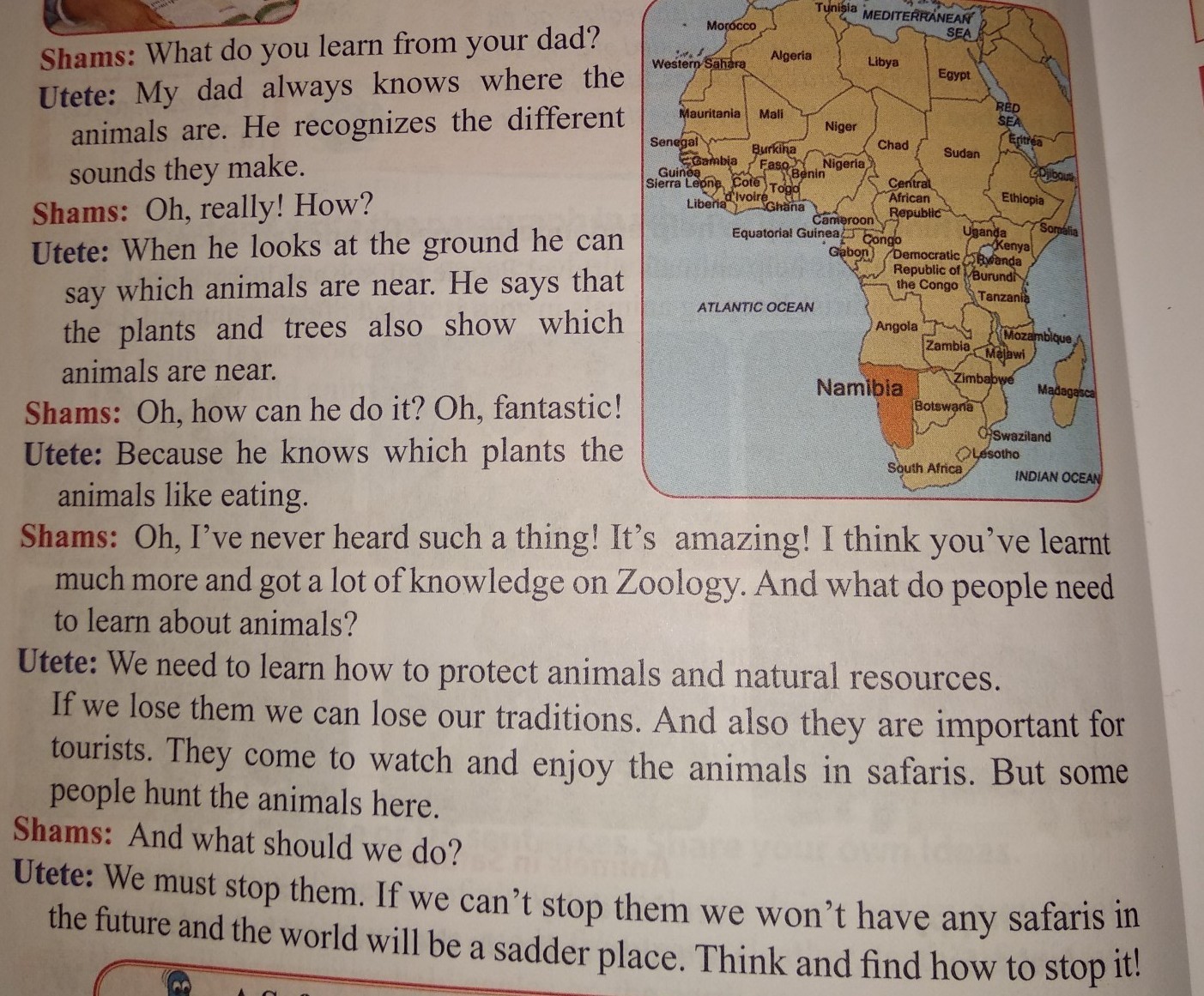 Утете: Нам нужно научиться защищать животных и природные ресурсы. Если мы потеряем их, мы можем потерять наши традиции. А также они важны для туристов. Они приходят, чтобы посмотреть и насладиться животными в сафари. Но некоторые люди здесь охотятся на животных.