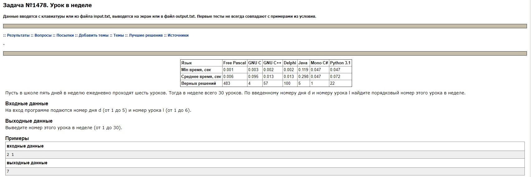 Пусть в школе пять дней в неделю ежедневно проходят шесть уроков. Тогда в неделе всего 30 уроков. По введенному номеру дня d и номеру урока l найдите порядковый номер этого урока в неделе.