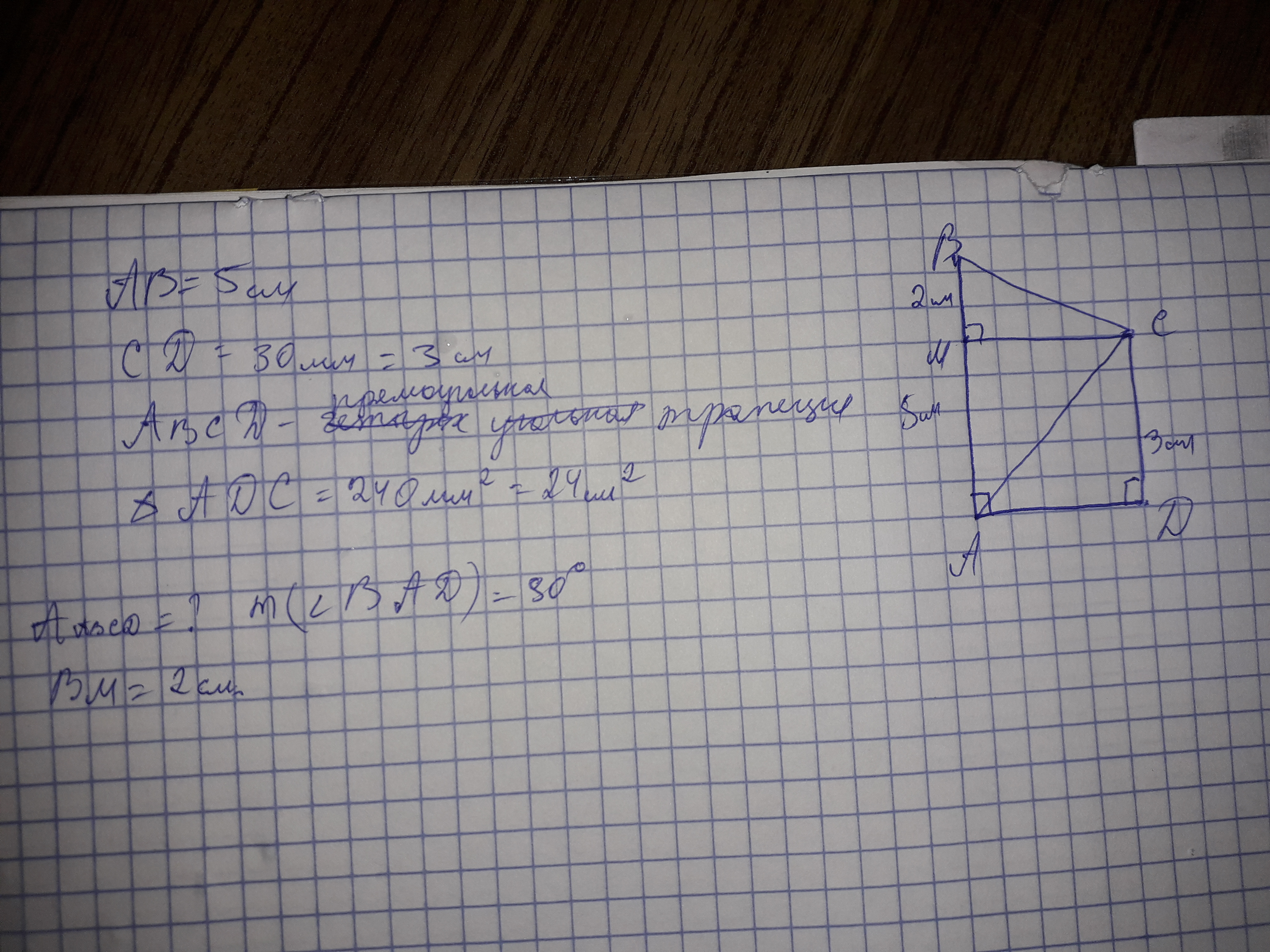 SΔADC=1/2CD·AD; AD=240·2:30=16 AD- высота трапеции, S трап.=(АВ+СД):2·АД=(3+5):2·16=64