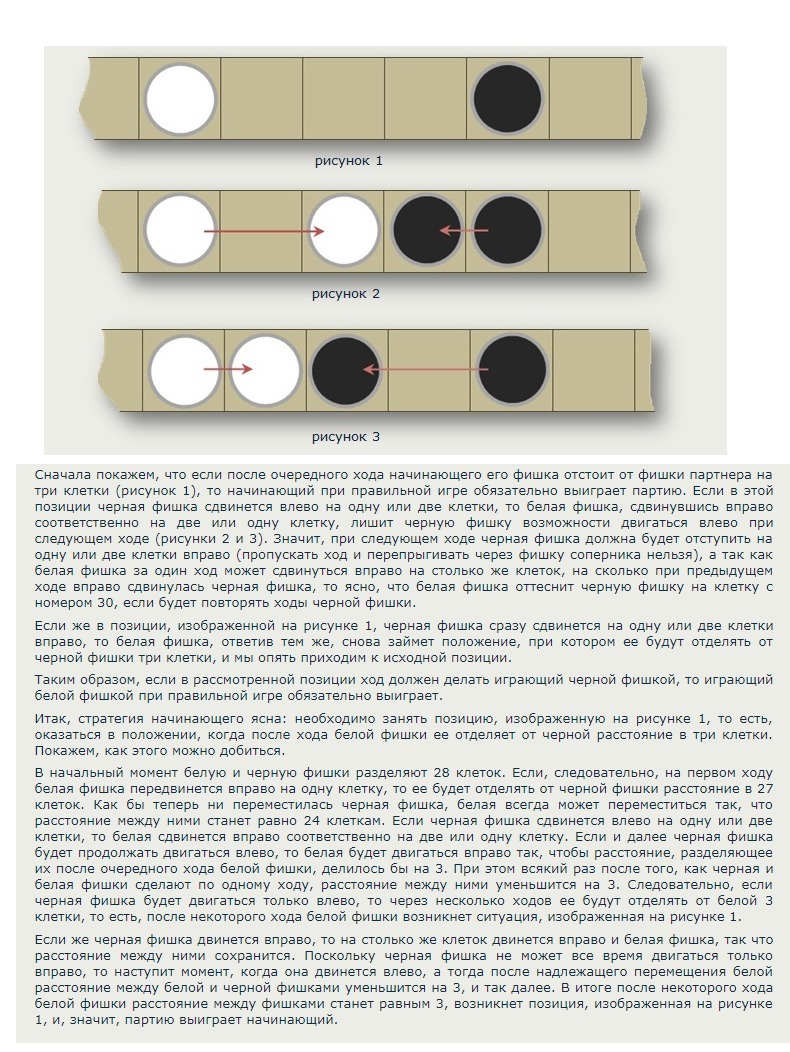 30 клеток расположены в ряд и занумерованы слева направо в порядке возрастания номеров. нА самое левой клетке(с номером 1) стоит белый фишка на самой правой клетке(с номером 30)- черная.Каждый из двух участников огоает фишкой определённого цвета, по очереди передвигая свою фишку на одно или два поля вперёд или назад. Запрещается пропускать ход и передвигать через фишку соперника. Проигравшим считается тот, у кого нет возможности сделать очередной ход.Кто выйграет при правильной игре: начинающий игру или его партнёр?