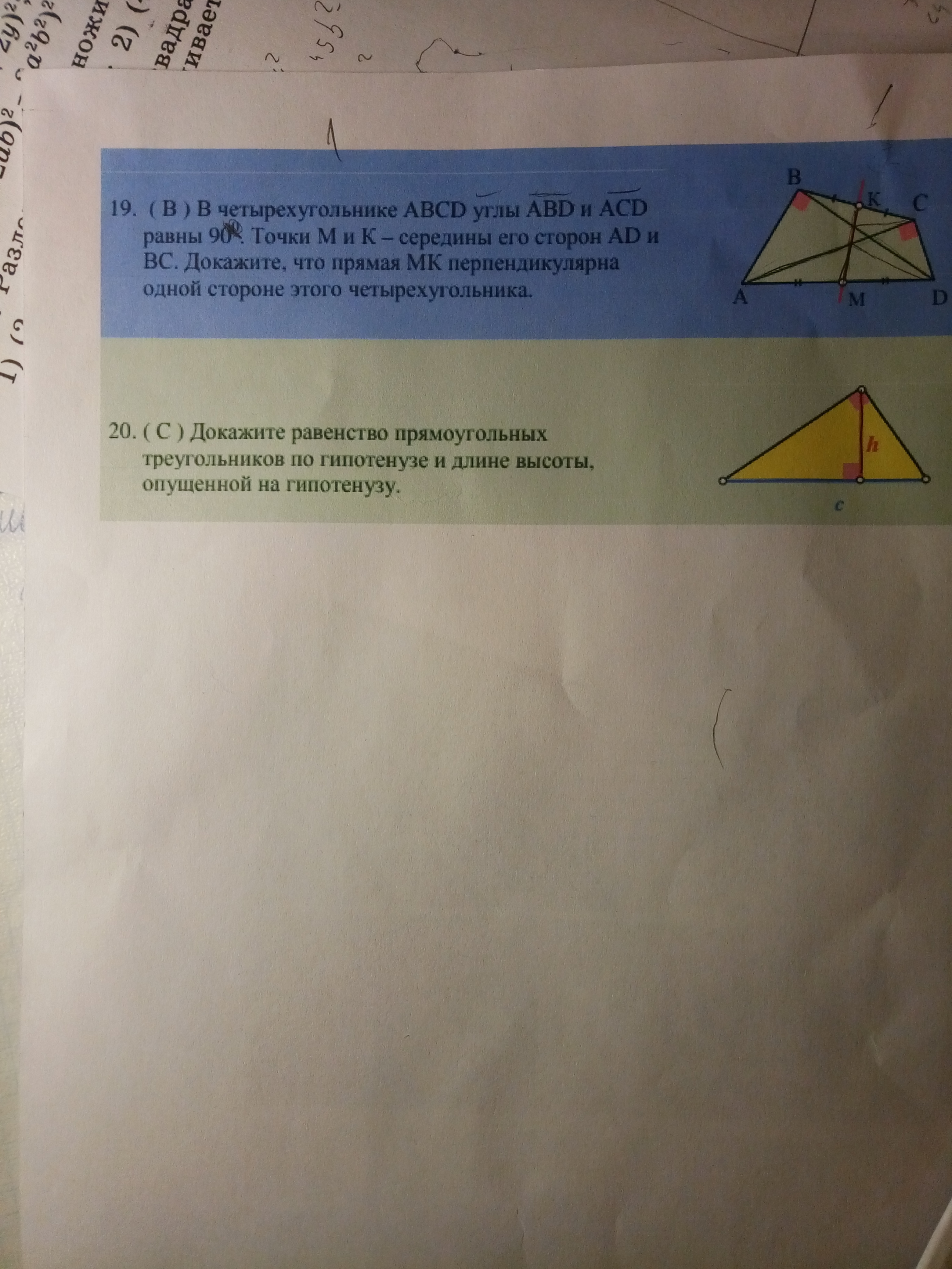 Пока первую напишу, раз срочно: Из прямого угла ΔАВД проведем медиану,(медиана, проведенная из прямого угла равна половине гипотенузы), анологично проведем медиану из вершины угла С ΔАСД , т.к гипотенуза у них общая, то и медианы равны. Рассмотрим ΔВМС - равнобедренный, т.к ВМ=МС, тогда МК- медиана одновременно и высота, а следовательно и перпендикуляр.