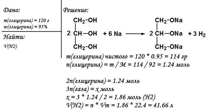 Найдите объем водорода, выделившегося в результате взаимодействия 120г глицерина, содержащий 5% примесей, с натрием, взятым в избытке