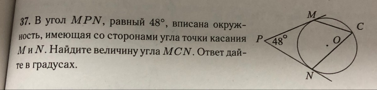 Соединим МN, рассмотрим ΔМNP - равнобедренный ∠HNM=(180-48):2=66 Теорема . Угол между касательной и хордой, проведенной в точку касания, равен половине дуги, стягиваемой этой хордой:∠МСN также равен половине центрального угла, тогда ∠МСN=66