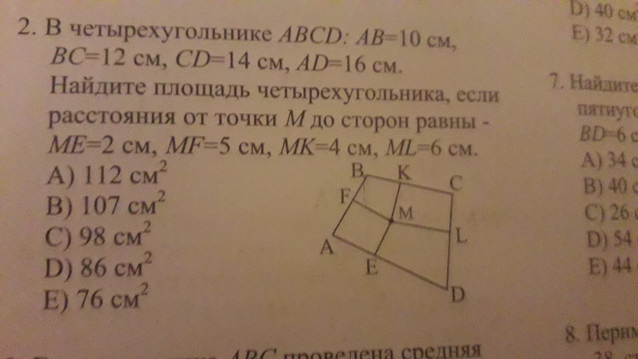 В четырёхугольниках ABCD :AB=10см,BC= 12см,CD=14,AD=16см.Найдите площадь четырёхугольника ,если расстояния от точки М до сторон равны-ME=2см,MF=5см,MK=4см,ML=6см.