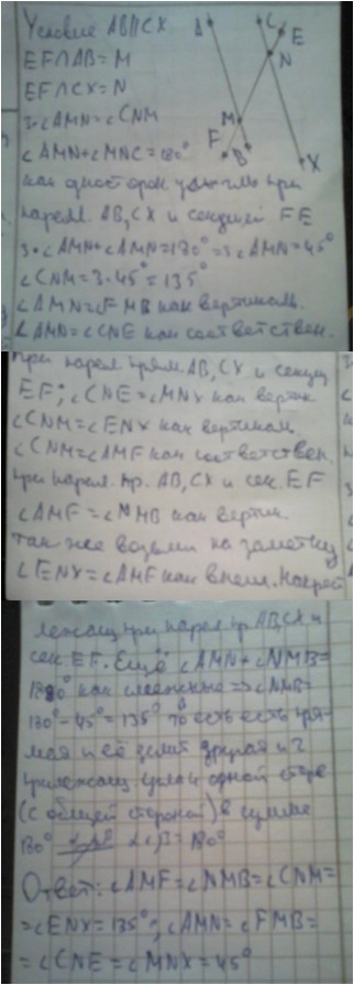 (Можно очень подробное решение пожалуйста иобьеснения какие это углы и т.к очень прошу пожалуйста). Параллельные прямые А B и СВ пересекаются с прямой ЕF в точках М и N,уголАМN в 3 раза меньше угла CNM НАЙДИТЕ все образовавшиеся углы