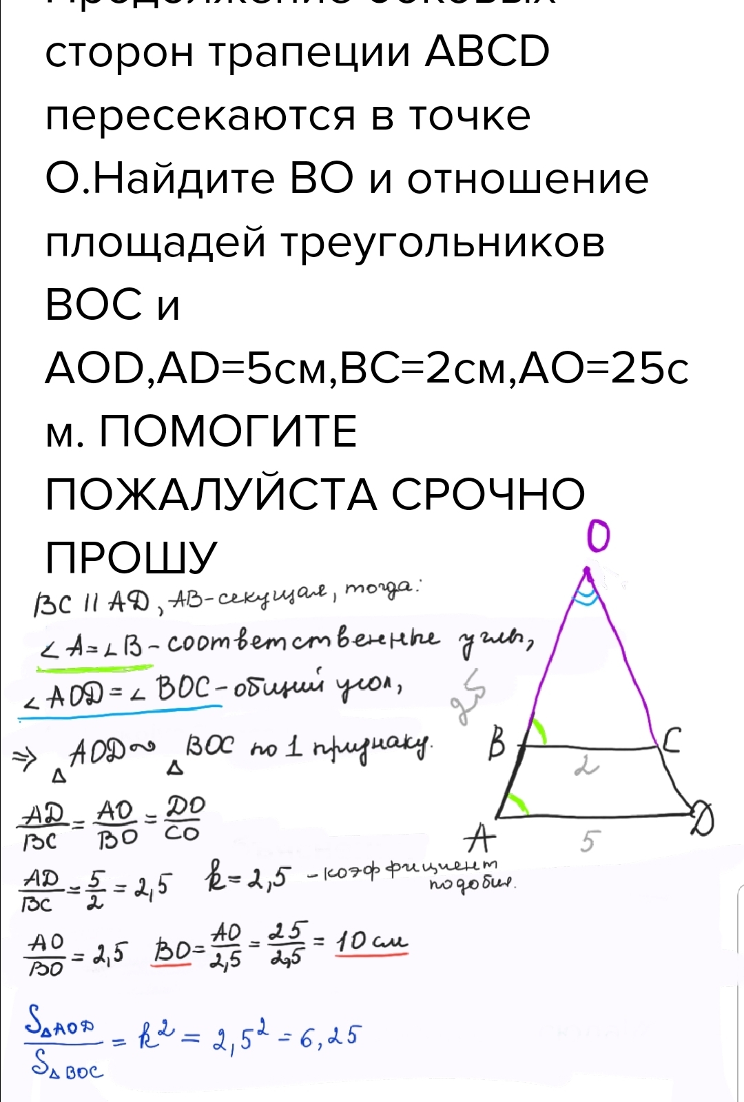 Продолжение боковых сторон трапеции ABCD пересекаются в точке O.Найдите BO и отношение площадей треугольников BOC и AOD,AD=5см,BC=2см,AO=25см. ПОМОГИТЕ ПОЖАЛУЙСТА СРОЧНО ПРОШУ
