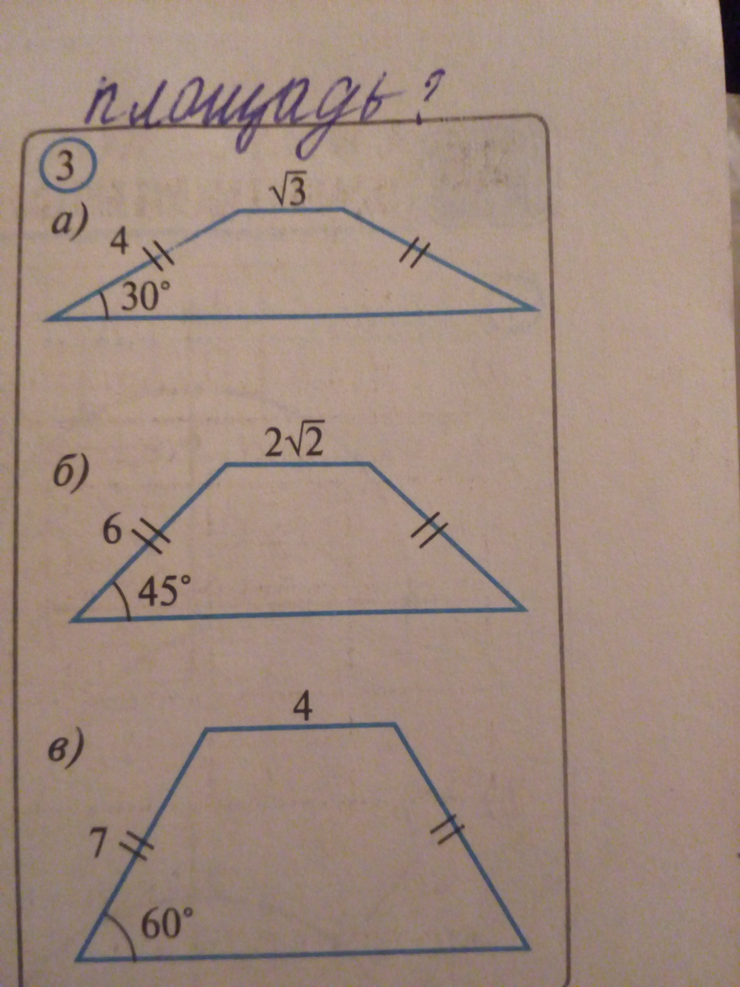 если одинаковые стороны, то это не значит, что фигура - равнобедренный треугольник. Это трапеция (равнобедренная). Площадь которой полусумма оснований на высоту.