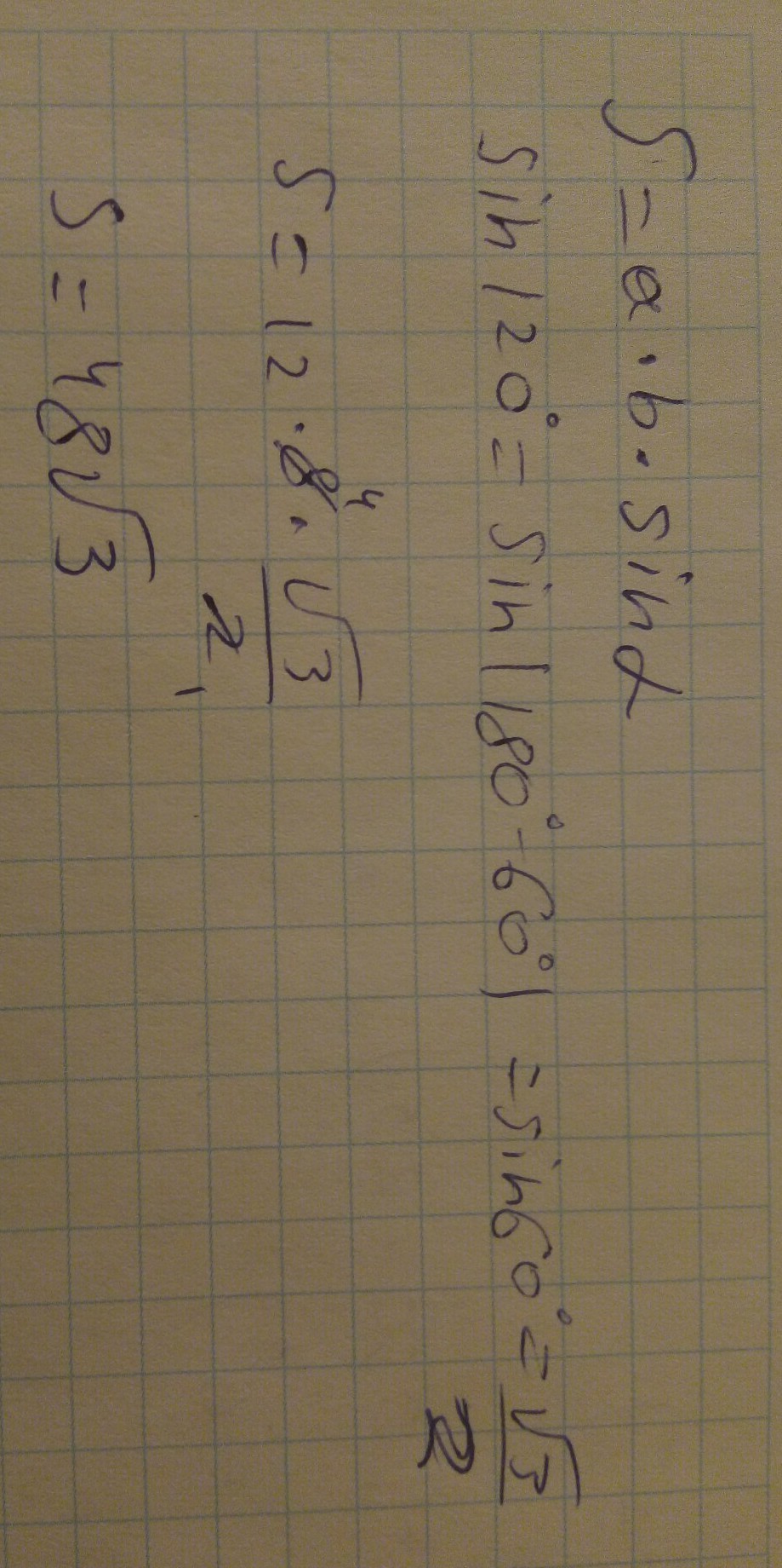 SABCD = AD·CD·sin60° = 12·8·√3/2 = 6·8·√3 = 48√3 см³