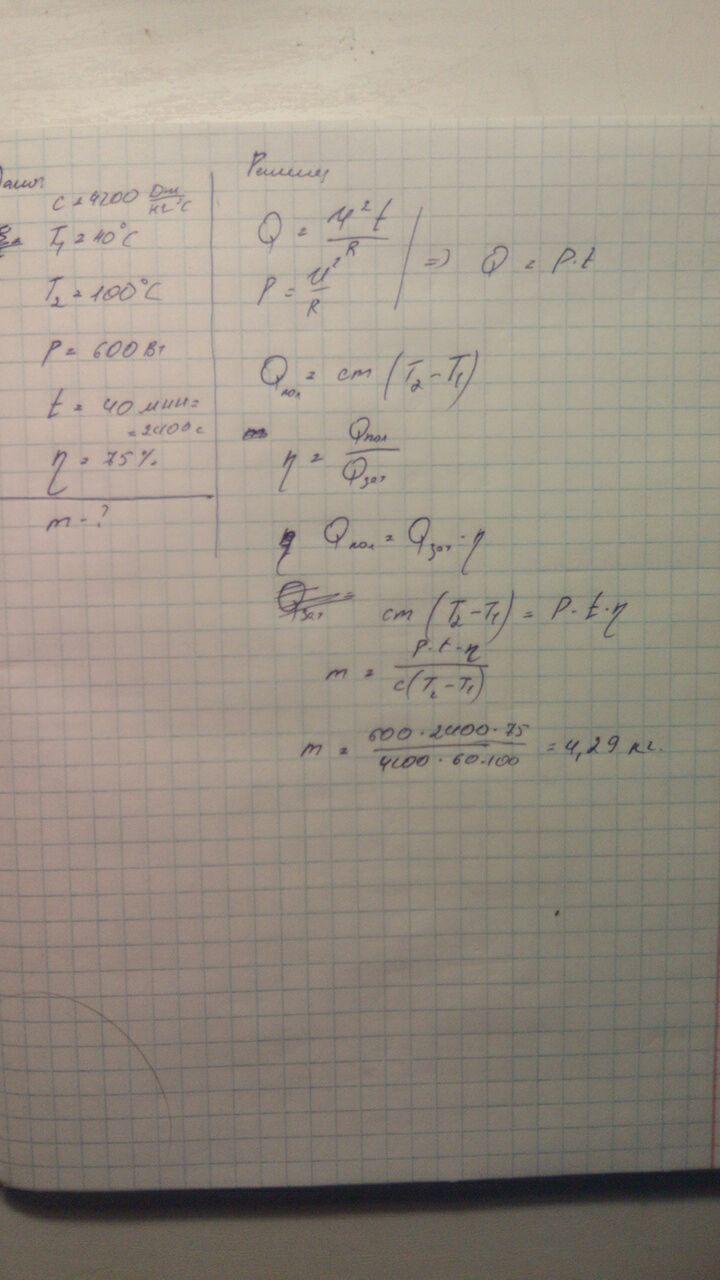 Чему равна масса воды, которую нагревают от 40 до 100 °С с помощью электронагревателя мощностью 600 Вт в течение 40 мин, если известно, что КПД нагревателя 75%?