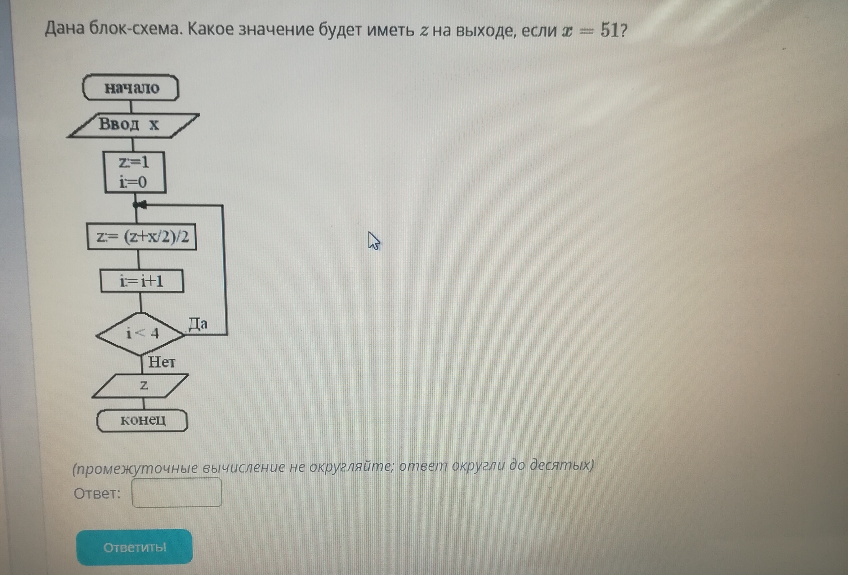 1 итерация (i=0): z=(z+x/2)/2=(1+51/2)/2=13.25