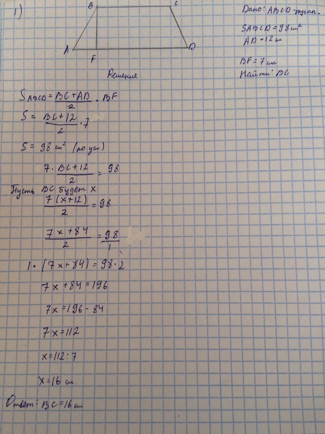 1. Площадь трапеции равна 98 см2, одно из оснований - 12 см, а высота -7 см. Найдите другое основание трапеции.