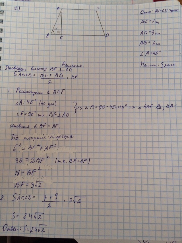 2. Найдите площадь трапеции, основания которой равны 7 см и 9 см, а боковая сторона равна 6 см и образует с Большим основанием угол 45 градусов.