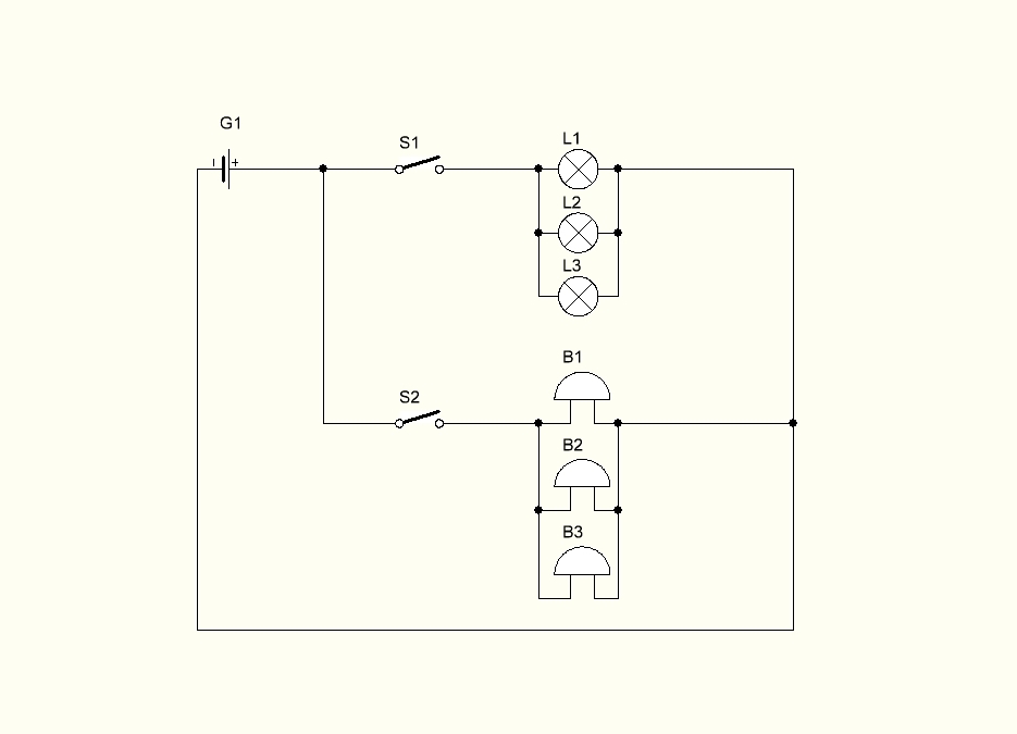Сделать схему цепи с тремя лампочками, и тремя звонками. один ключ включает все лампочки, другой все звонки (98 балов даю)