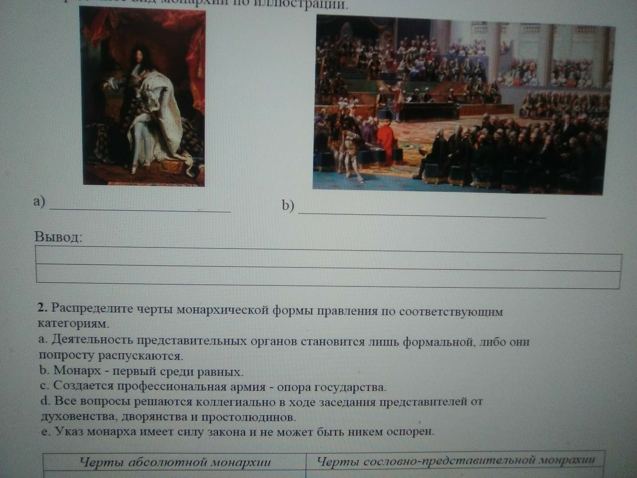 Черты абсолютной монархии: a,c,e