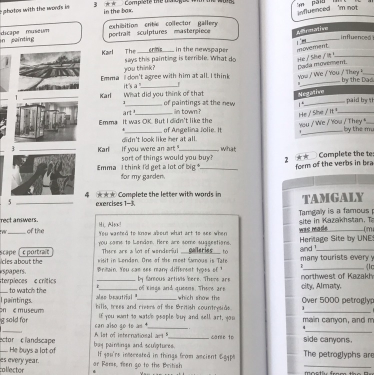 There are a lot of wonderful galleries to visit in London, One of the most famous is Tate Britain. You can see many different types of 1 masterpieces by famous artists here. There are 2 portraits of kings and queens. There are also beautiful 3 landscapes which show the hills, trees and rivers of the British countryside. If you want to watch people buy and sell art, you can also go to an 4 exhibition. A lot of international art 5 collectors come to buy paintings and sculptures. If you're interested in things from ancient Egypt or Rome, then go to the British