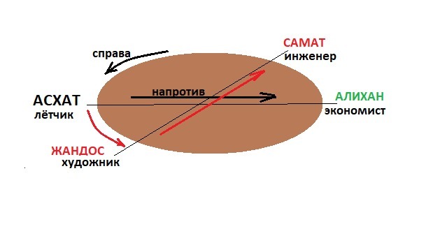 За круглым столом сидят Алихан, Самат, Жандос, И Асхат. Среди них есть лётчик, художник, экономист, инженер. Справа от инженера и напротив экономиста сидит Асхат Асхат не художник. Жандос сидит справа от лётчика и напротив самата. У кого какая профессия?