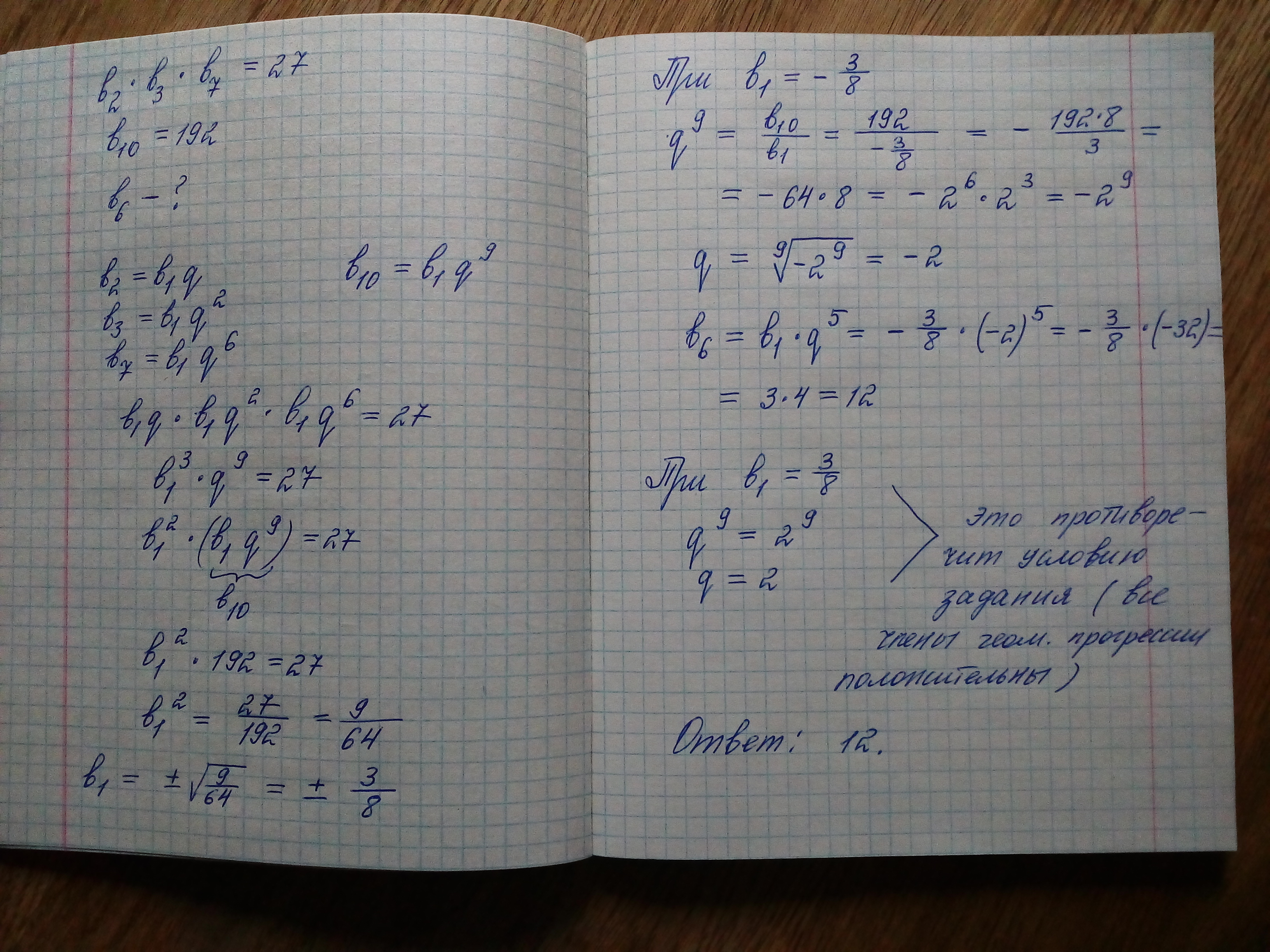 в геометрической прогрессии со знакочередующимися членами произведение 2-го, 3-го и 7-го членов равно 27, а 10-ый член равен 192. Найдите 6-ой член прогрессии.