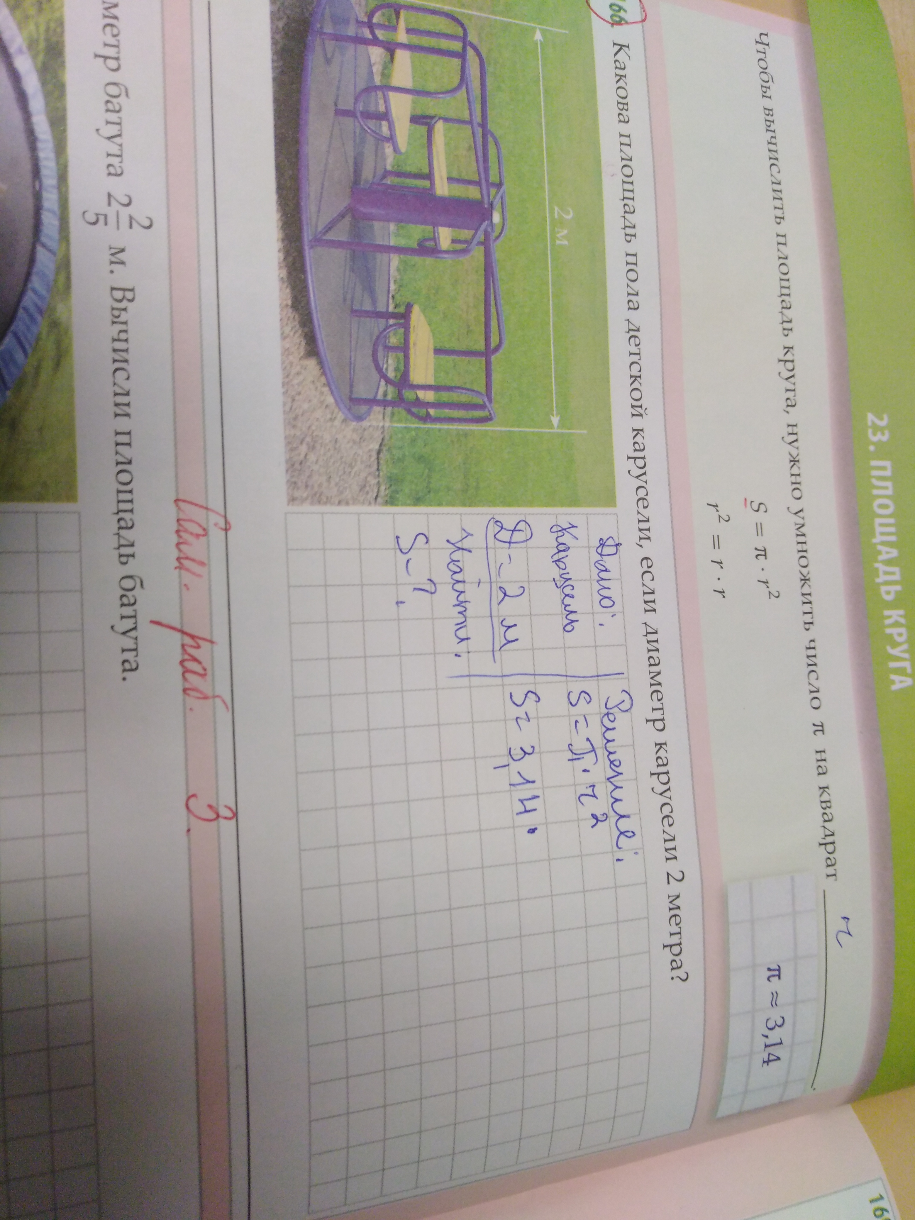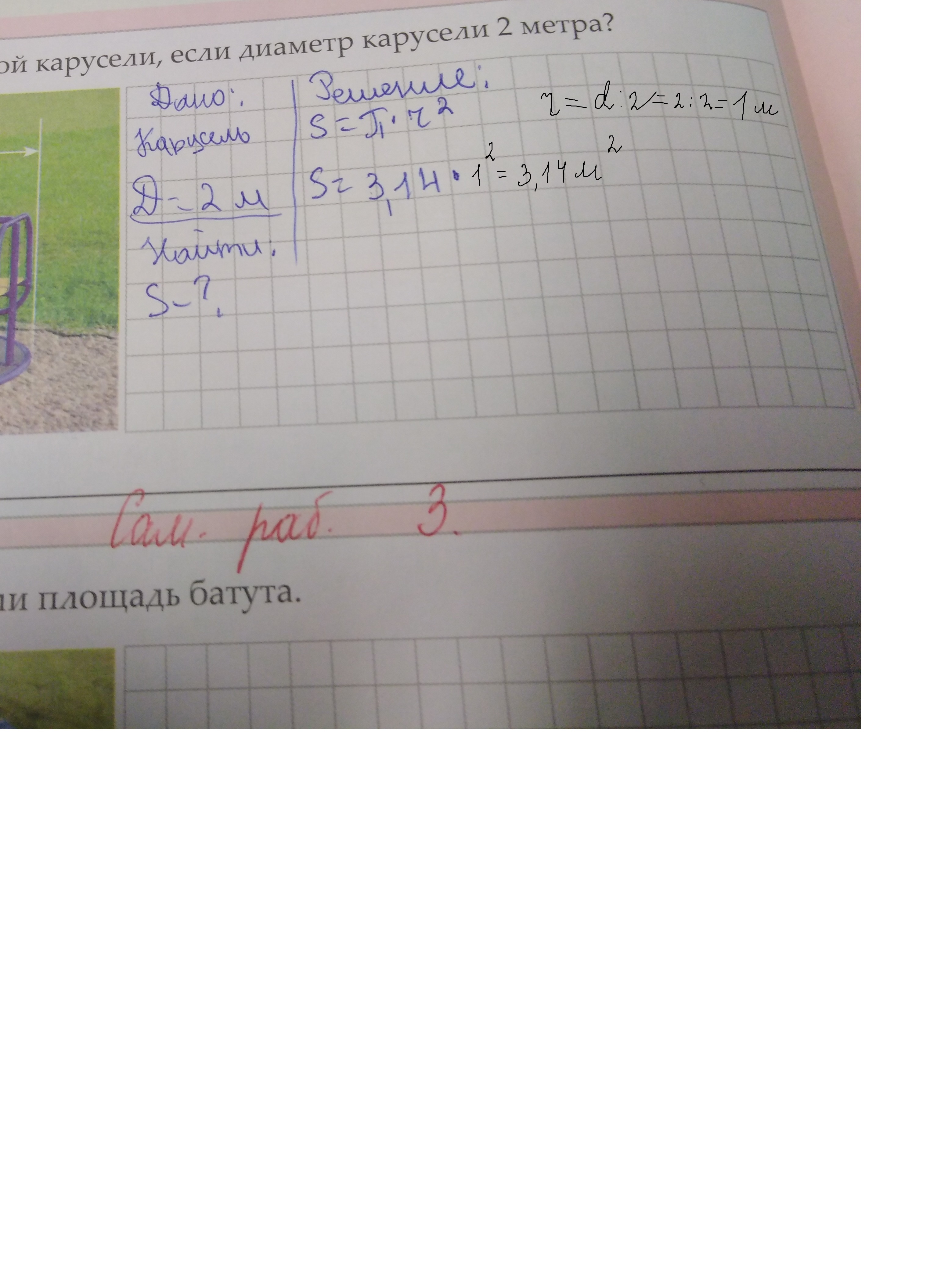Сначало найти r:r=1/2dто есть 1 метр S=3.14*1=3.14